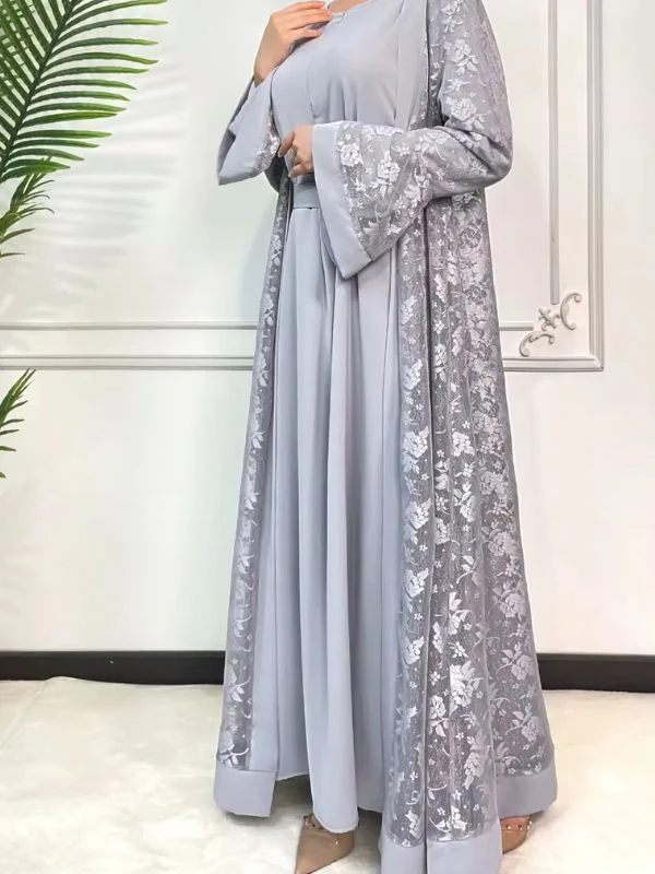 Abaya dubai luxe gris perle en dentelle – L’éclat discret de la finesse orientale