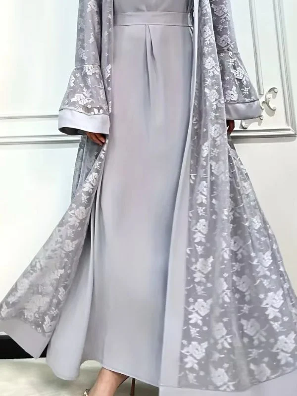 Le gris perle, symbole de sérénité et de modernité, fait de cette abaya une pièce versatile qui se marie facilement avec des accessoires dorés ou argentés.