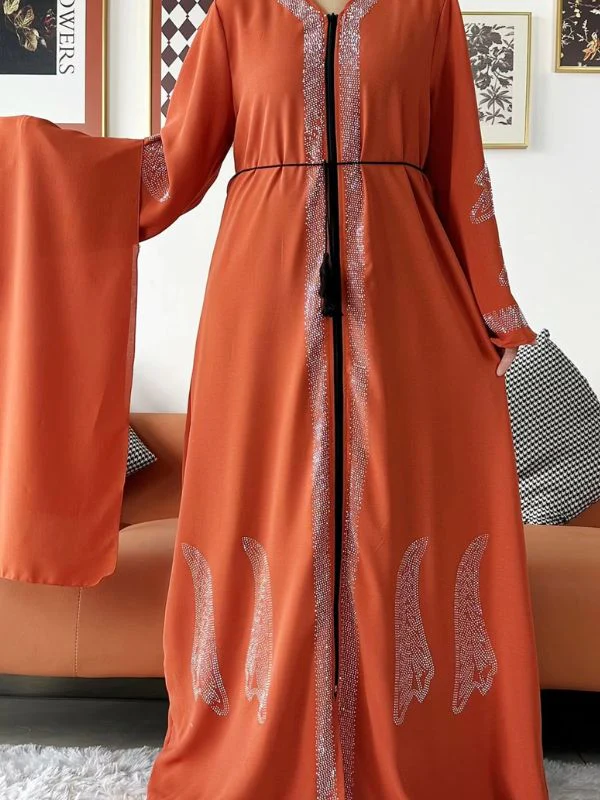 Plongez dans une fusion éclatante entre raffinement oriental et modernité avec cette abaya dubai luxe orange brûlé. Cette tenue est conçue pour illuminer votre présence et captiver les regards grâce à sa couleur chaleureuse et à ses finitions somptueuses. Offrant une allure majestueuse, elle devient rapidement un incontournable pour vos événements et grandes occasions.