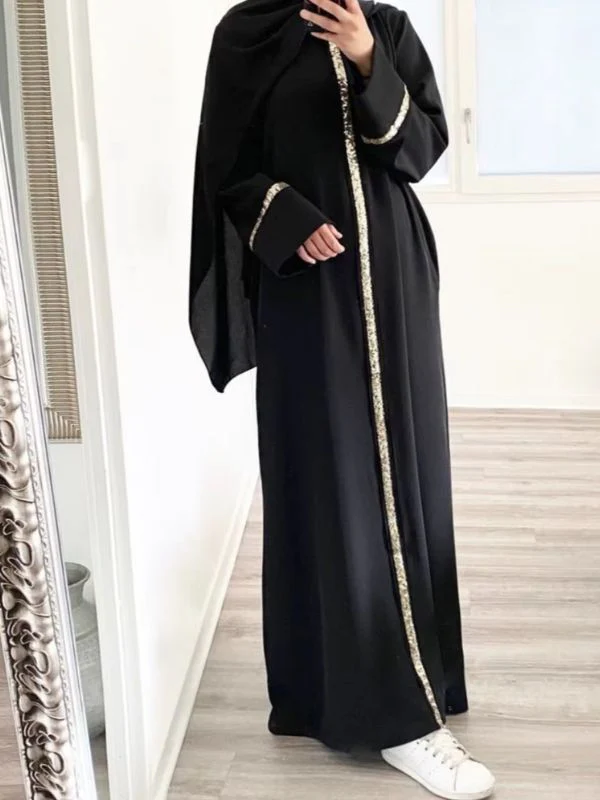 Loin des paillettes et des exagérations, cette abaya séduit par son impact minimaliste. Chaque couture, chaque détail, chaque bordure dorée participe à une esthétique fluide et maîtrisée. Elle ne cherche pas à briller pour briller, mais à révéler la force tranquille de celle qui la porte.