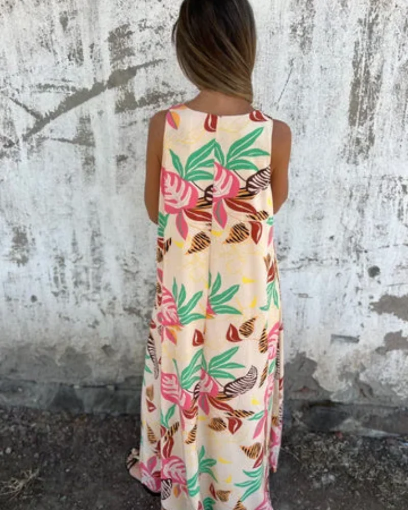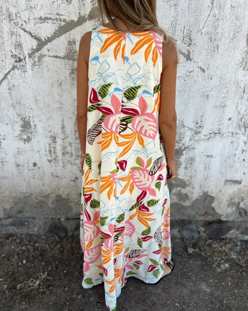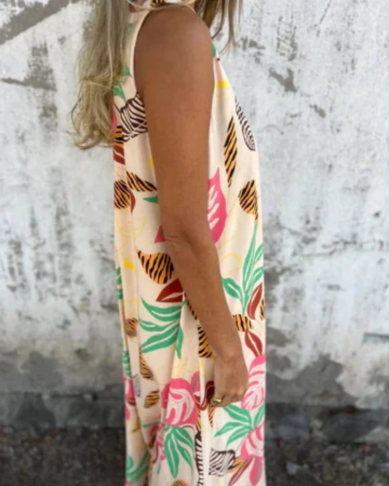 - Impression florale tropicale audacieuse sur l’ensemble de la robe