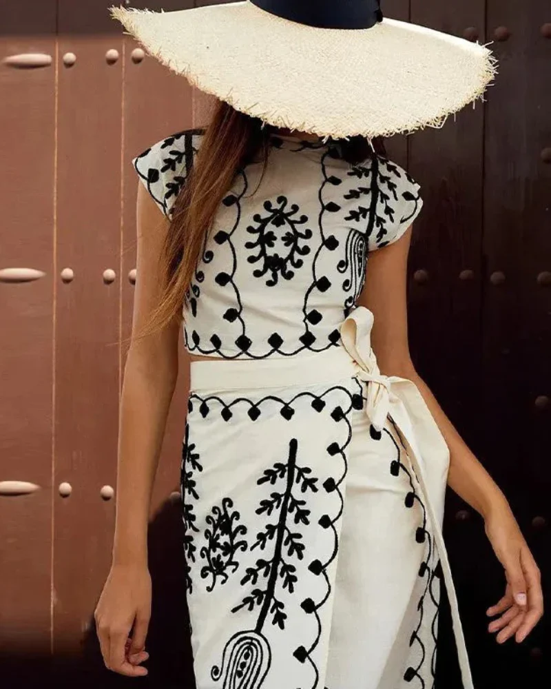 Cet ensemble comprend un haut court sans manches et une jupe midi portefeuille avec un détail de nœud à la taille, confectionné dans un tissu léger et aéré, parfait pour les journées ensoleillées.