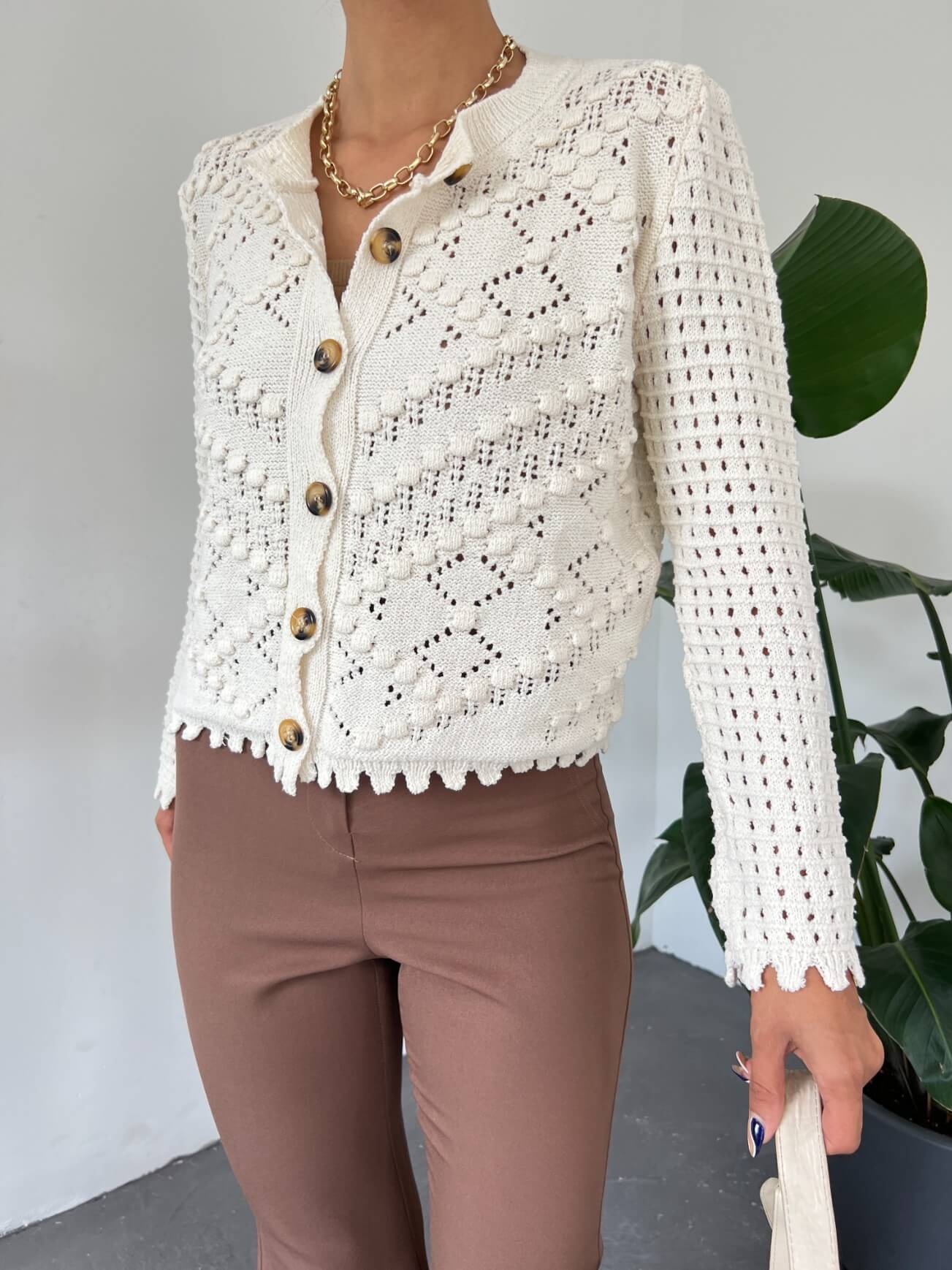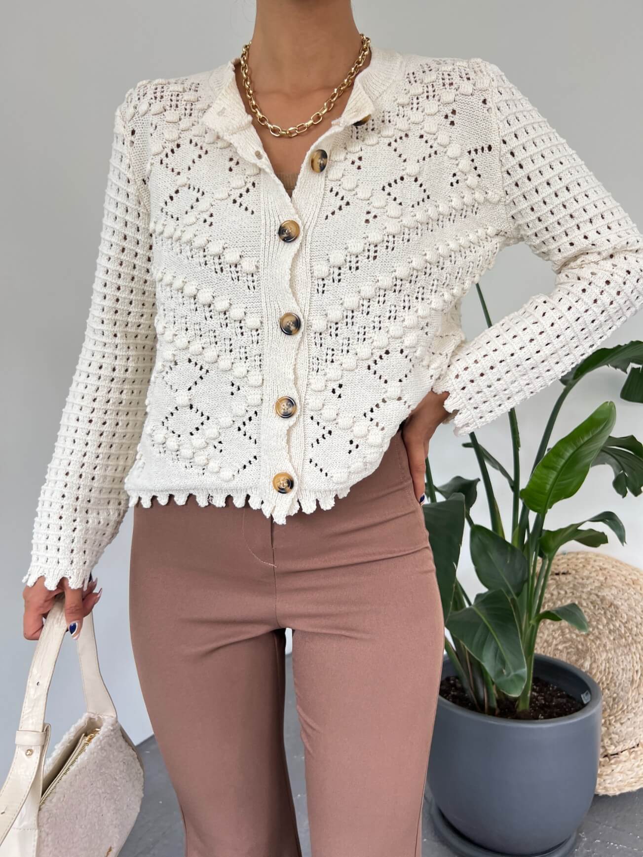 Cardigan Boutonné Ajouré Avec Pompon – Beige