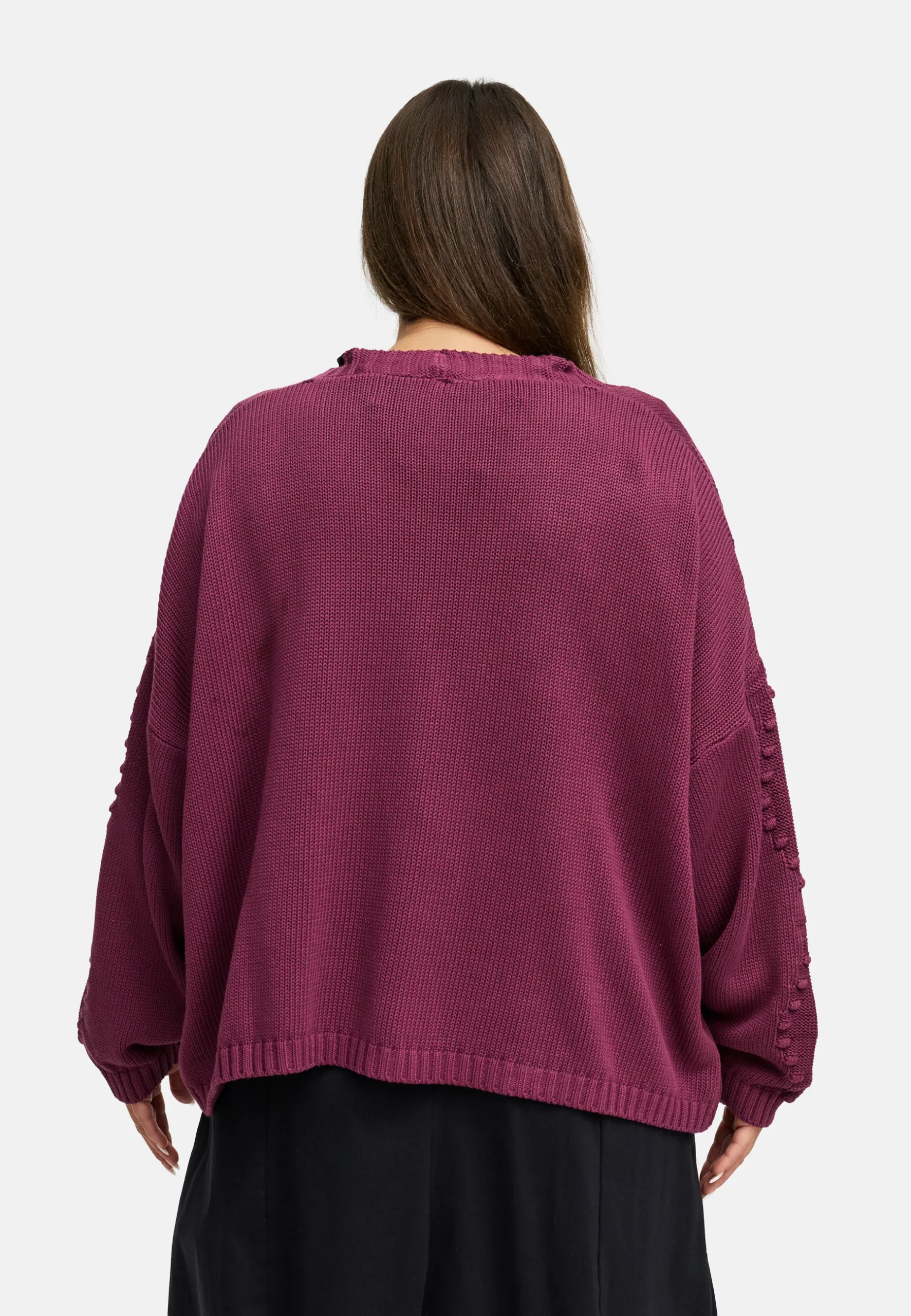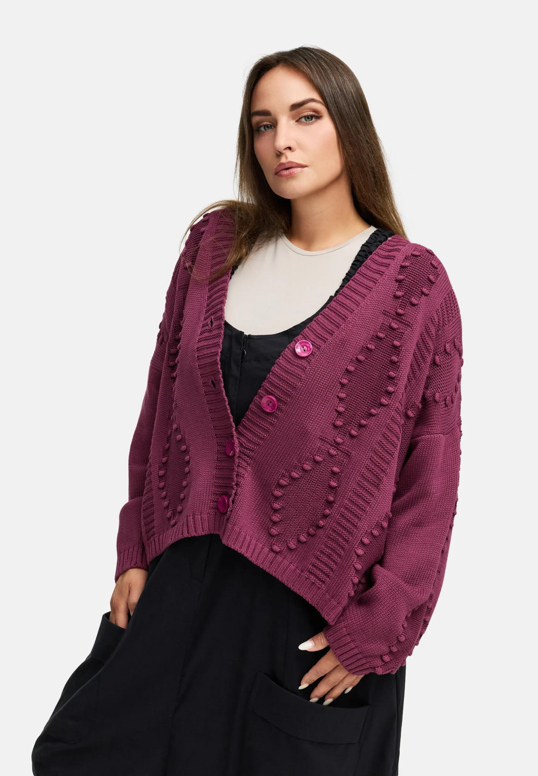 • Coupe : Coupe ample, longueur raccourcie, parfait pour le superposition.• Détails : Tricot avec éléments structurés, col en V, patte de boutonnage, larges poignets.• Couleurs : Disponible en noir et bordeaux.• Style : Polyvalent – décontracté ou chic.