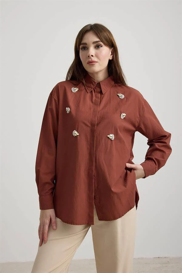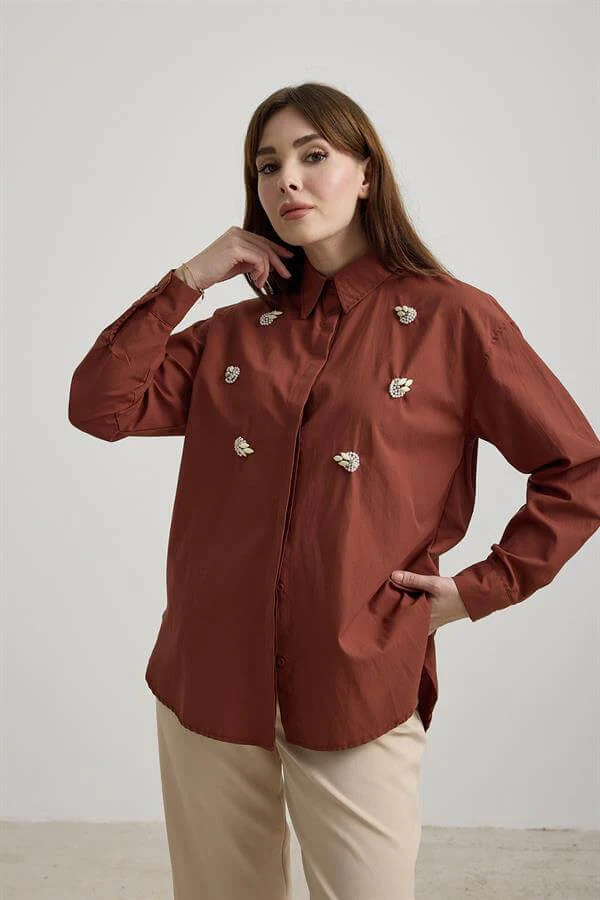 Chemise Femme En Popeline Marron Avec Pierres Sur Le Devant