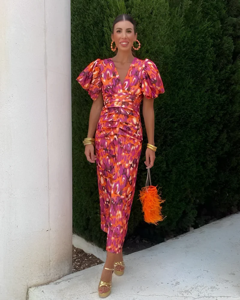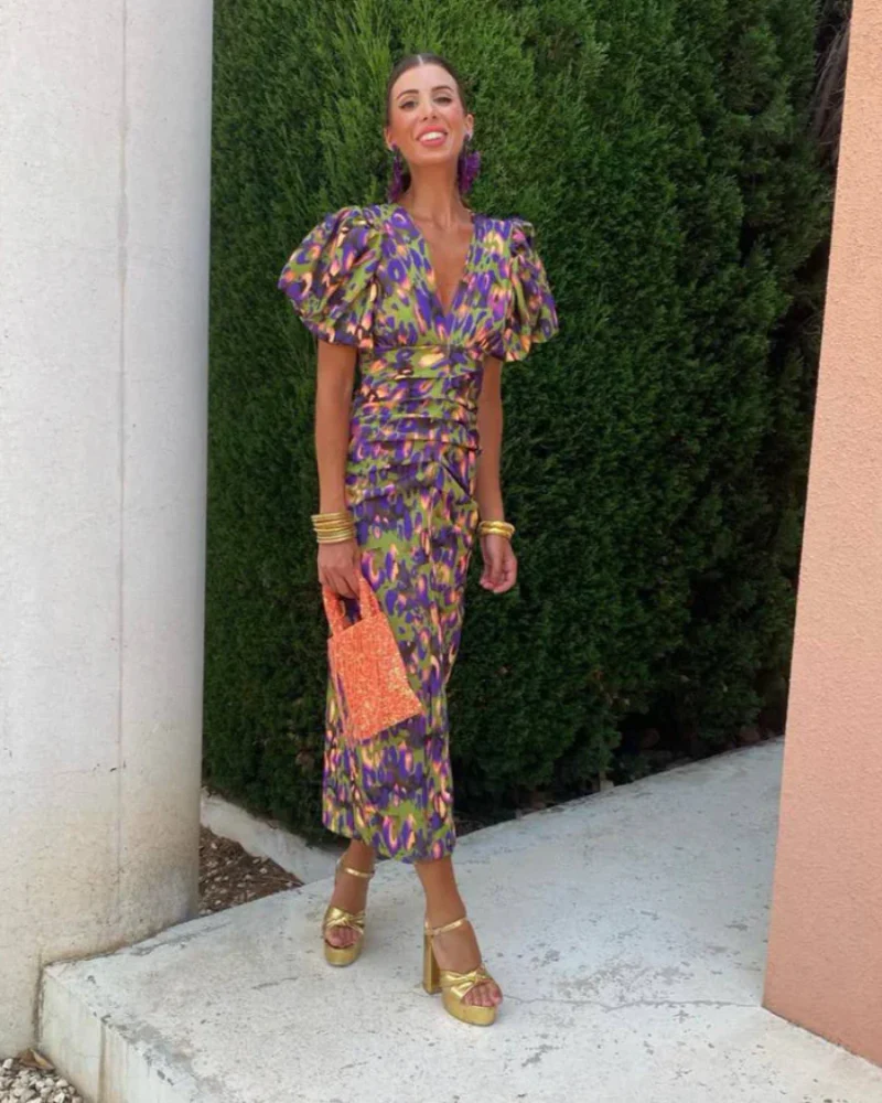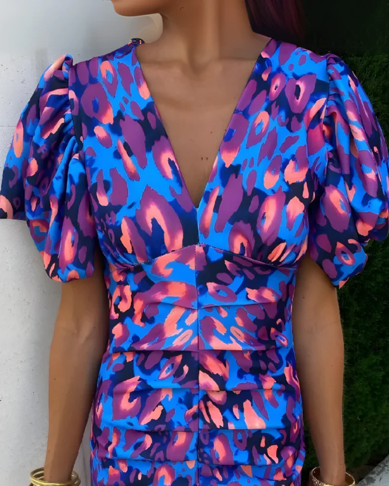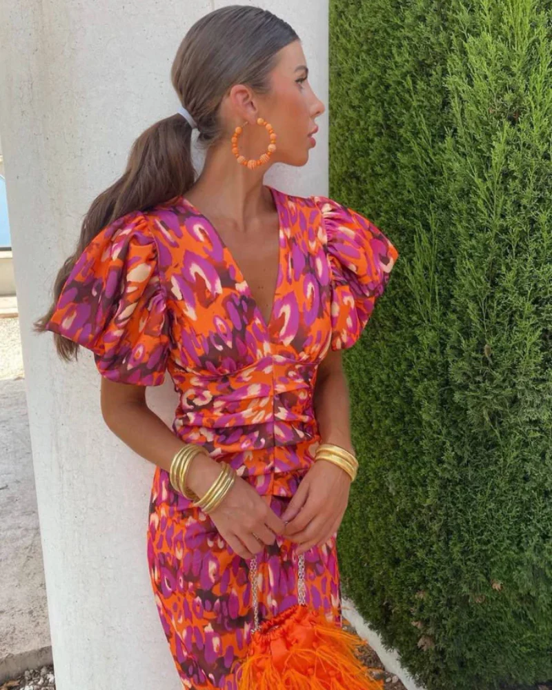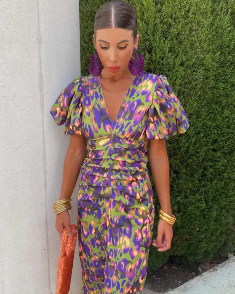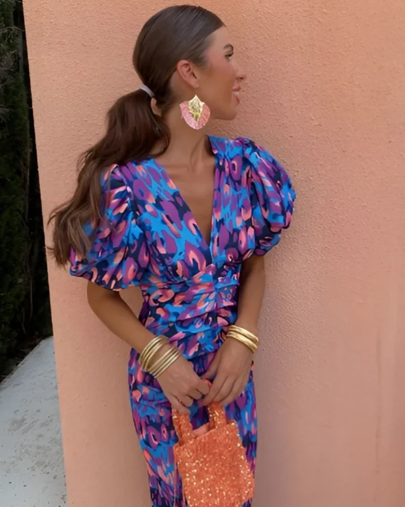 Ses manches bouffantes volumineuses, sa taille froncée flatteuse et son imprimé coloré en font un choix idéal pour les occasions spéciales où vous souhaitez briller.