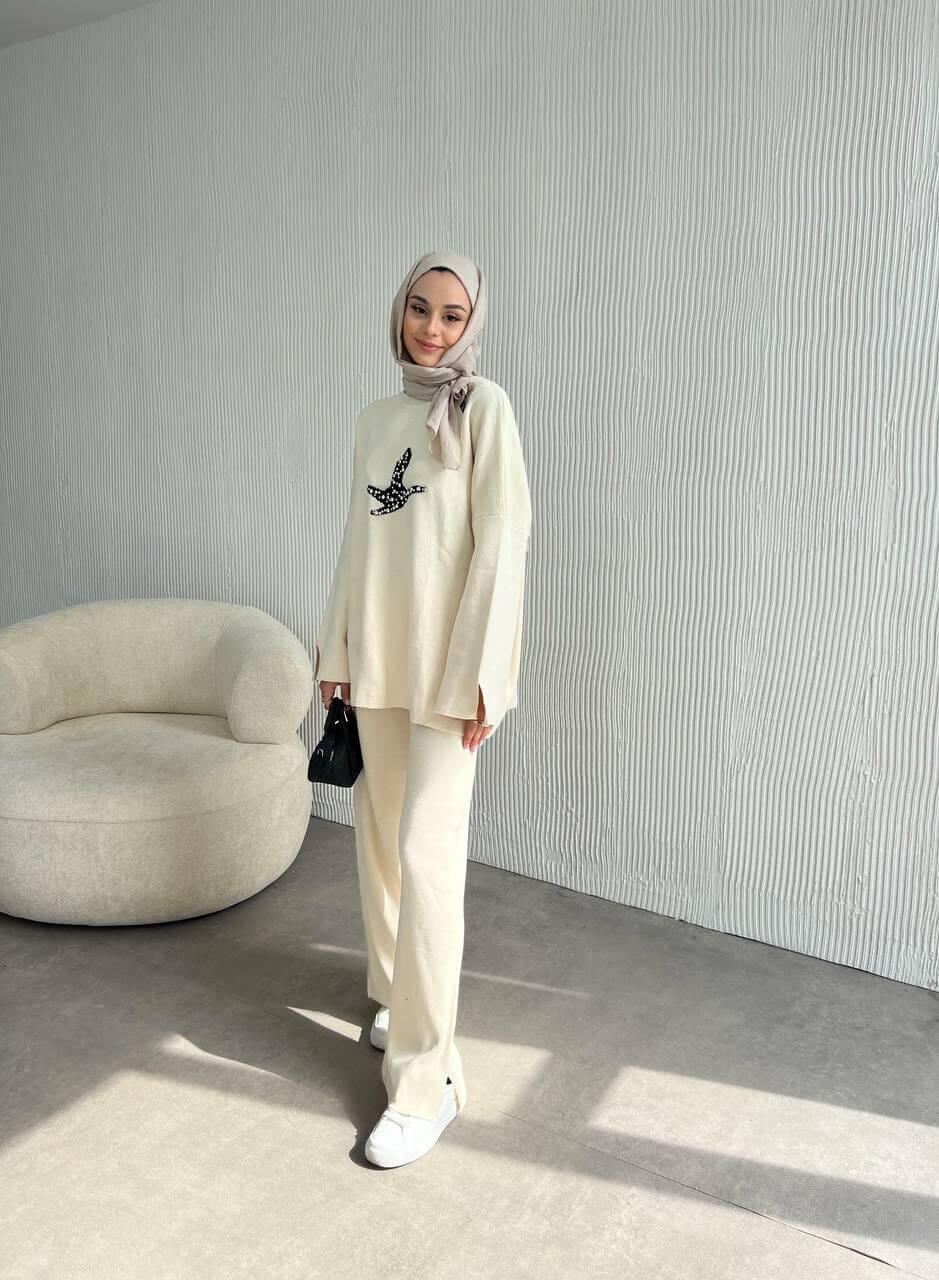 Ensemble composé d’une chemise oversize à col montant boutonné et manches longues avec finitions élastiquées, assortie d’un pantalon large à taille élastique, confectionné en 100% tencel pour une tenue fluide, respirante et confortable au quotidien, avec un tombé ample idéal pour une silhouette pudique et élégante ; ensemble disponible en tailles M ⁄ L et L ⁄ XL.