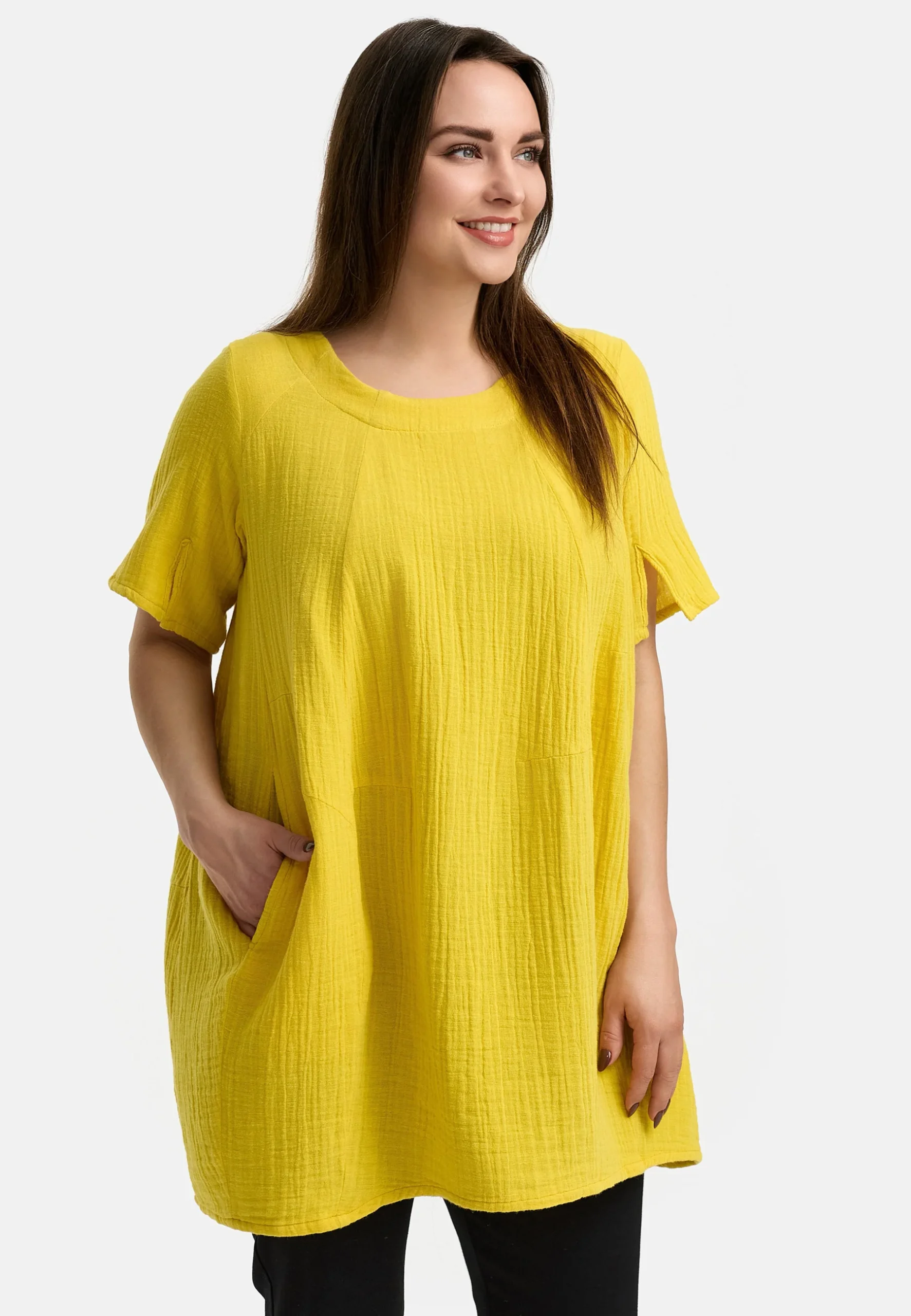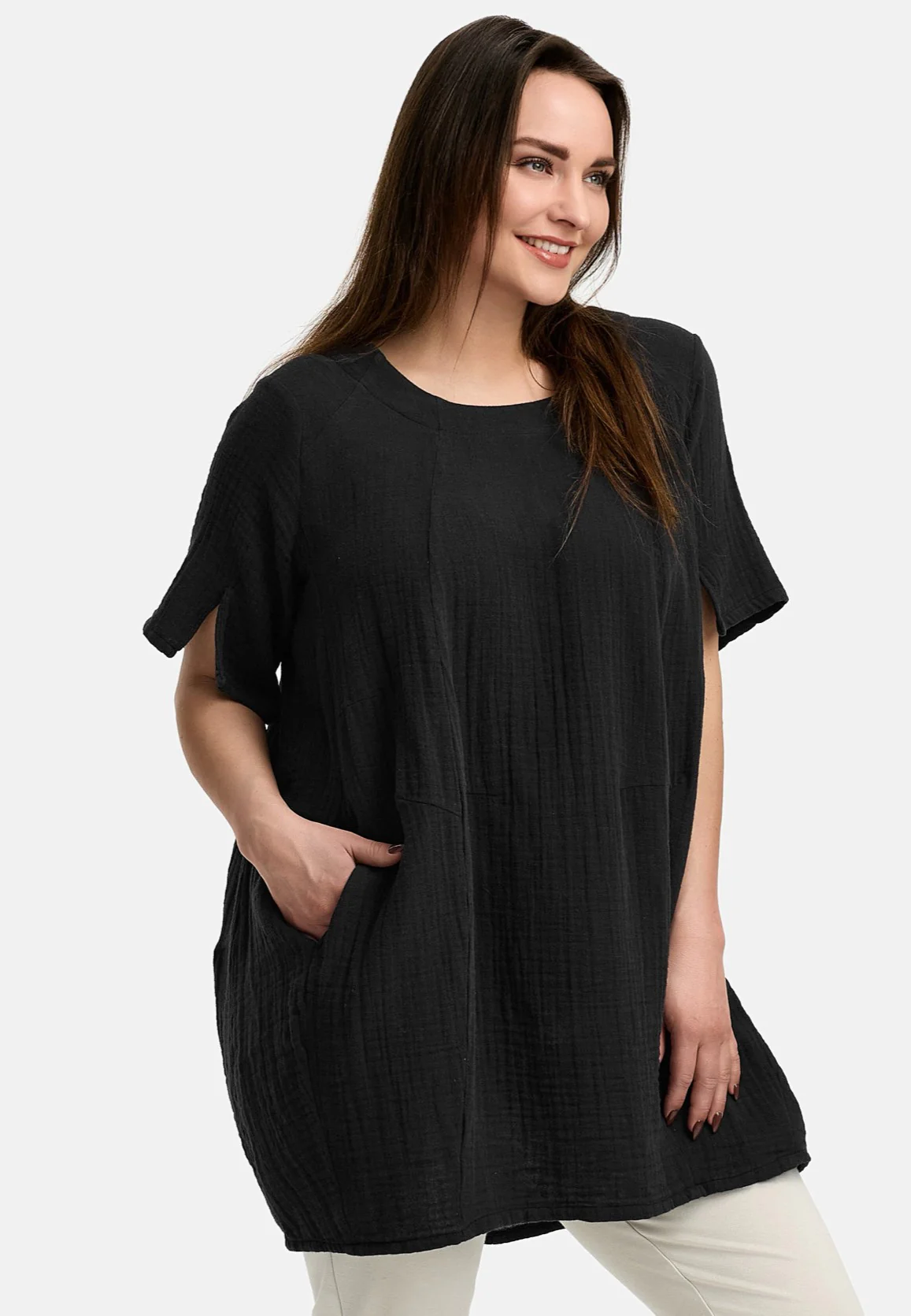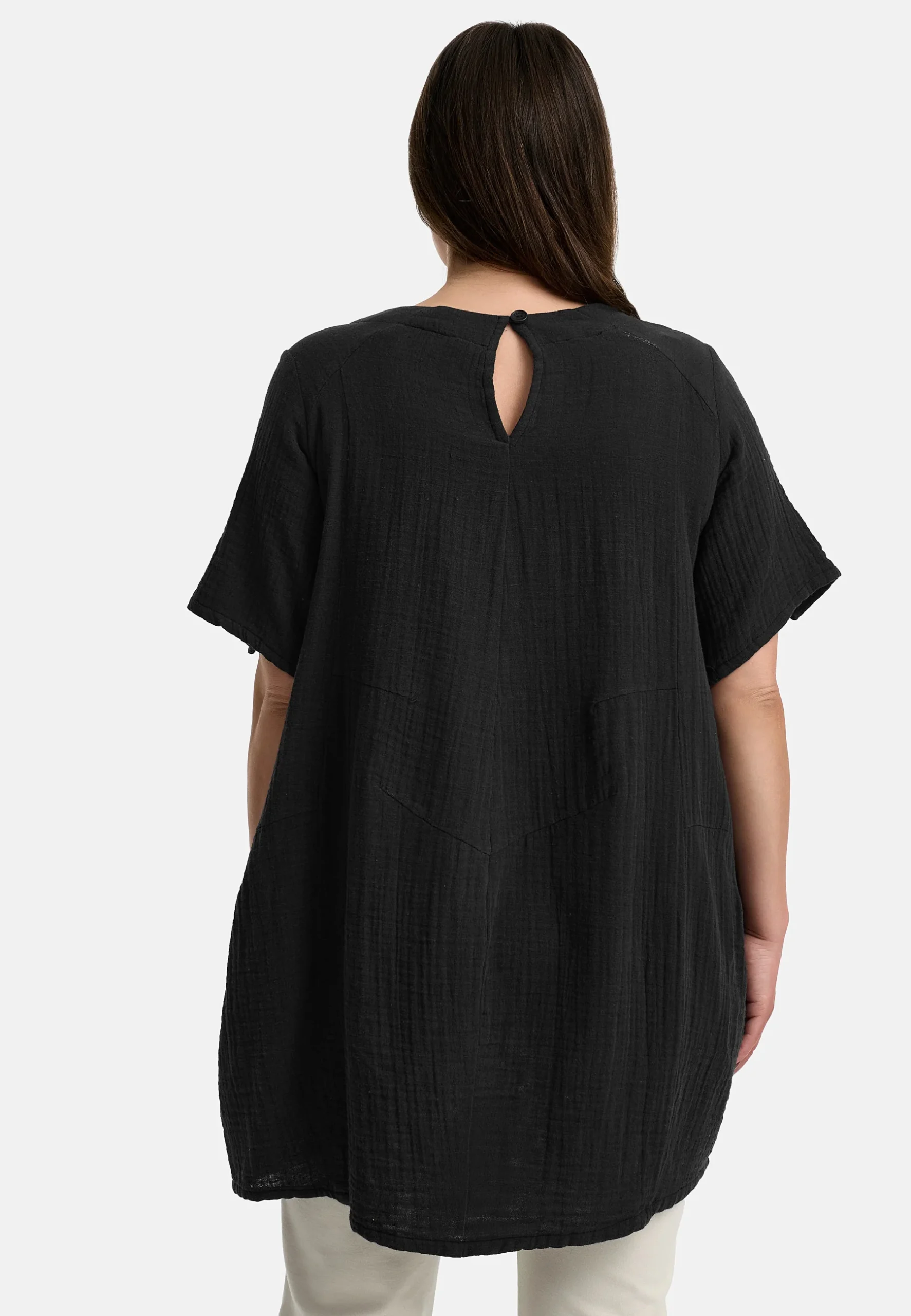 · Ligne A ample avec silhouette en O· Col rond· Manches courtes avec fente à l’ourlet des manches· Poches fendues· Fermeture à bouton au dos confère à la tunique une touche élégante· Idéal à combiner avec des pantalons à coupe étroite