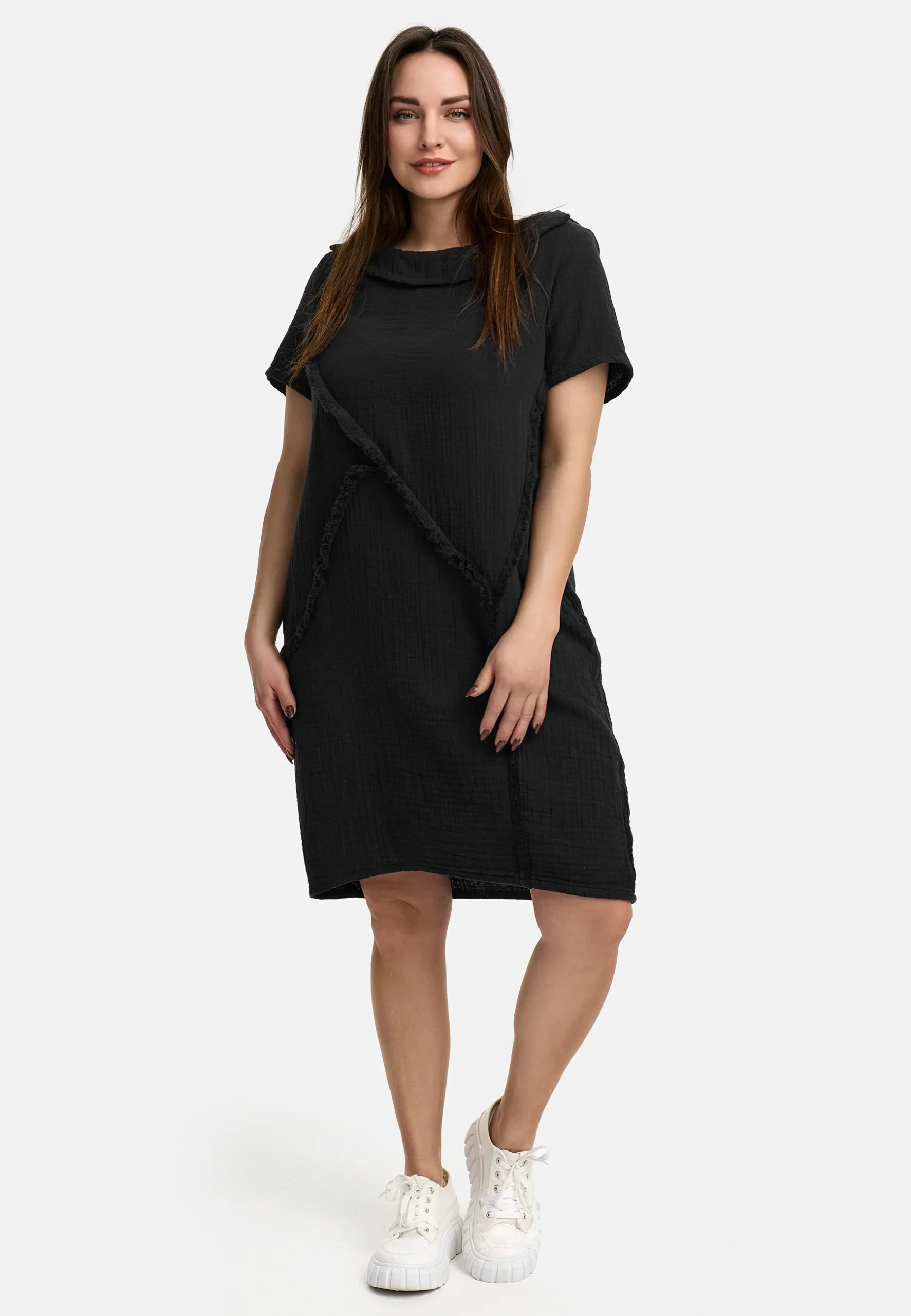· Ligne A ample· Encolure ronde drapée supplémentaire· Manches courtes· Poches fendues · Longueur genou· Coutures décoratives asymétriques · Dans des couleurs éclatantes