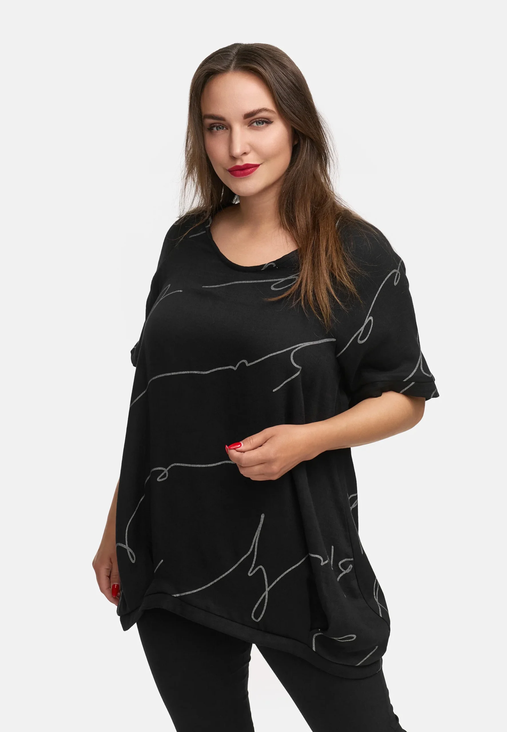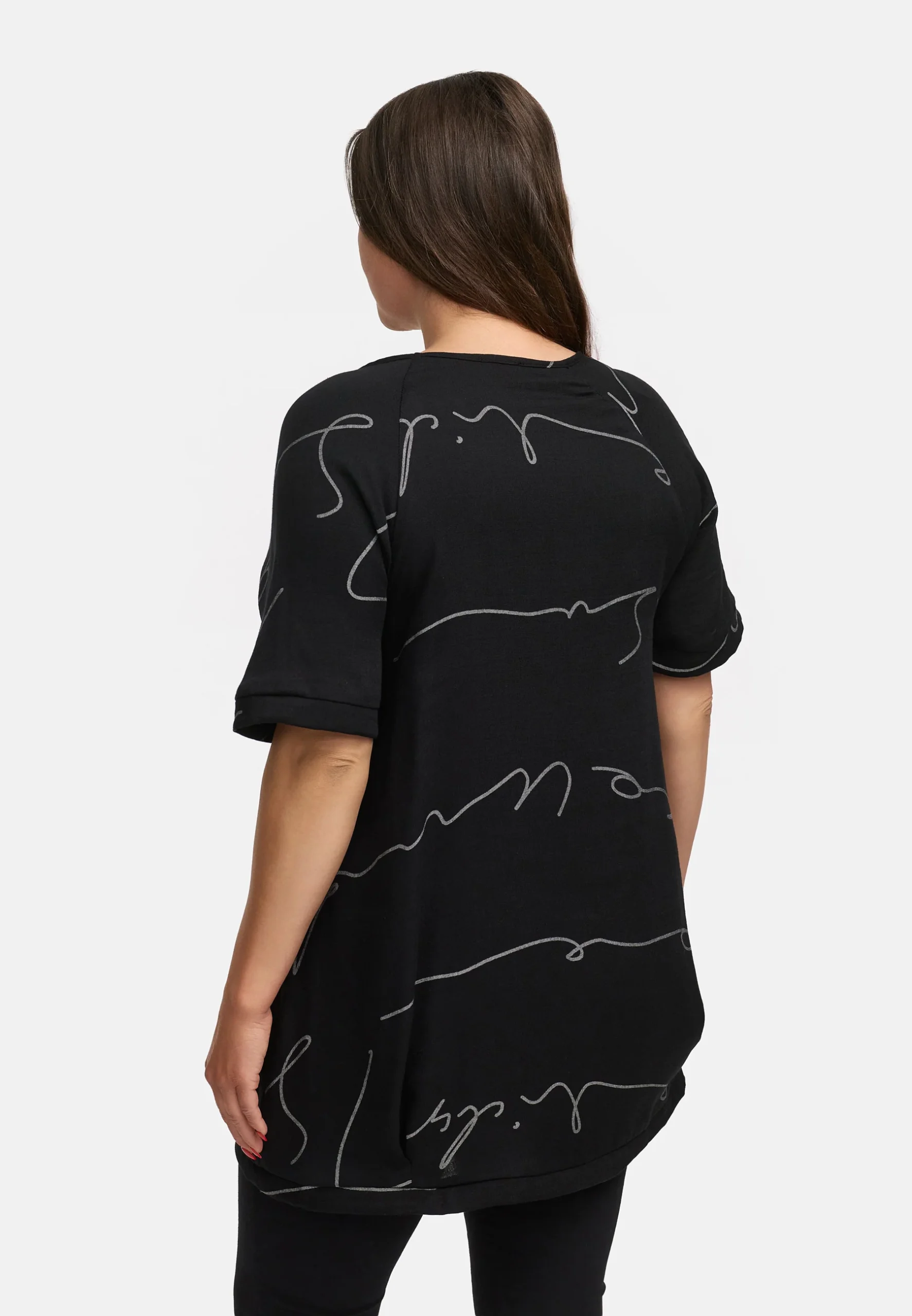 • Déclaration de mode : Cette blouse se distingue par son imprimé moderne à lettrage abstrait, qui lui confère une touche artistique et individuelle. • Coupe unique : La coupe ample combinée à un ourlet arrondi légèrement froncé crée une silhouette ballon flatteuse, alliant parfaitement confort et style. • Encolure ronde : L’encolure ronde classique […]