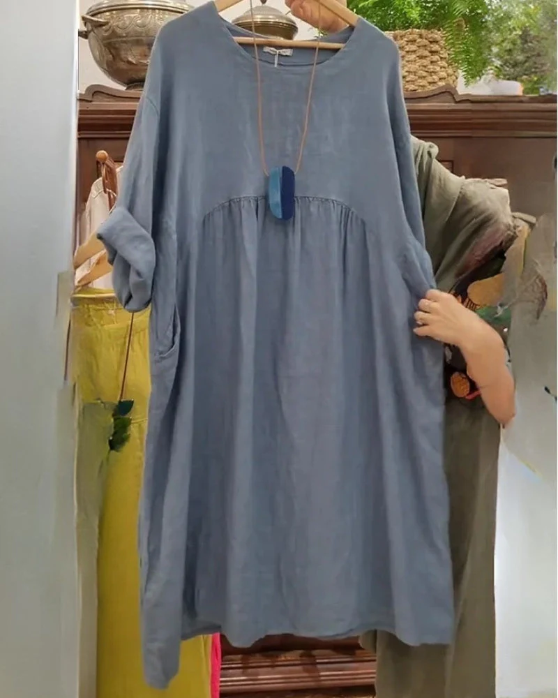 Symbole d’une sophistication décontractée, parfaite pour les journées chaudes et les tenues du quotidien confortables.Confectionnée dans un mélange respirant de coton et de lin, cette robe longueur genou présente une silhouette ample et fluide, un joli col arrondi et des manches courtes et larges.Le léger froncement sous la poitrine offre un tombé décontracté, tandis que les poches latérales pratiques renforcent son charm casual.