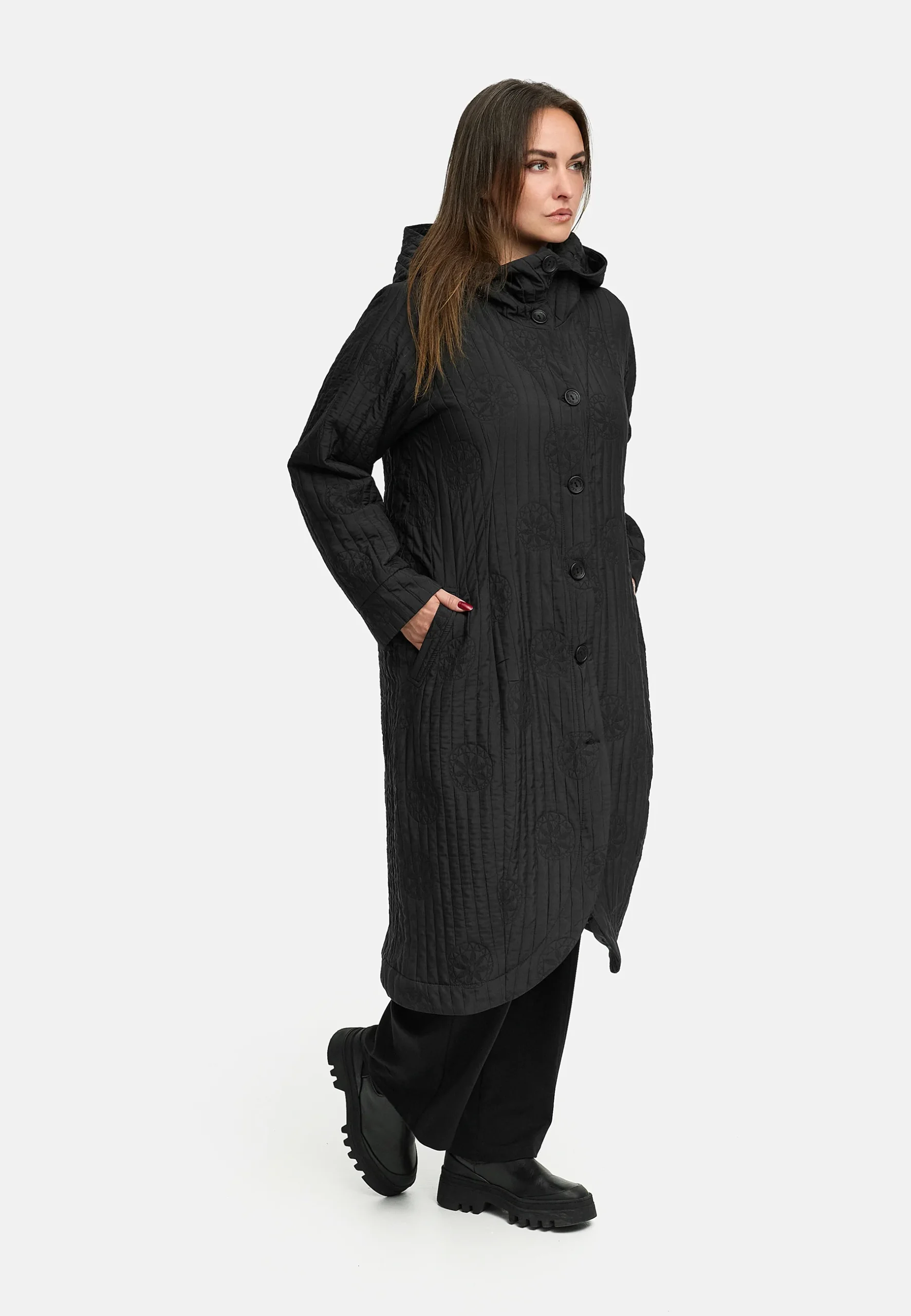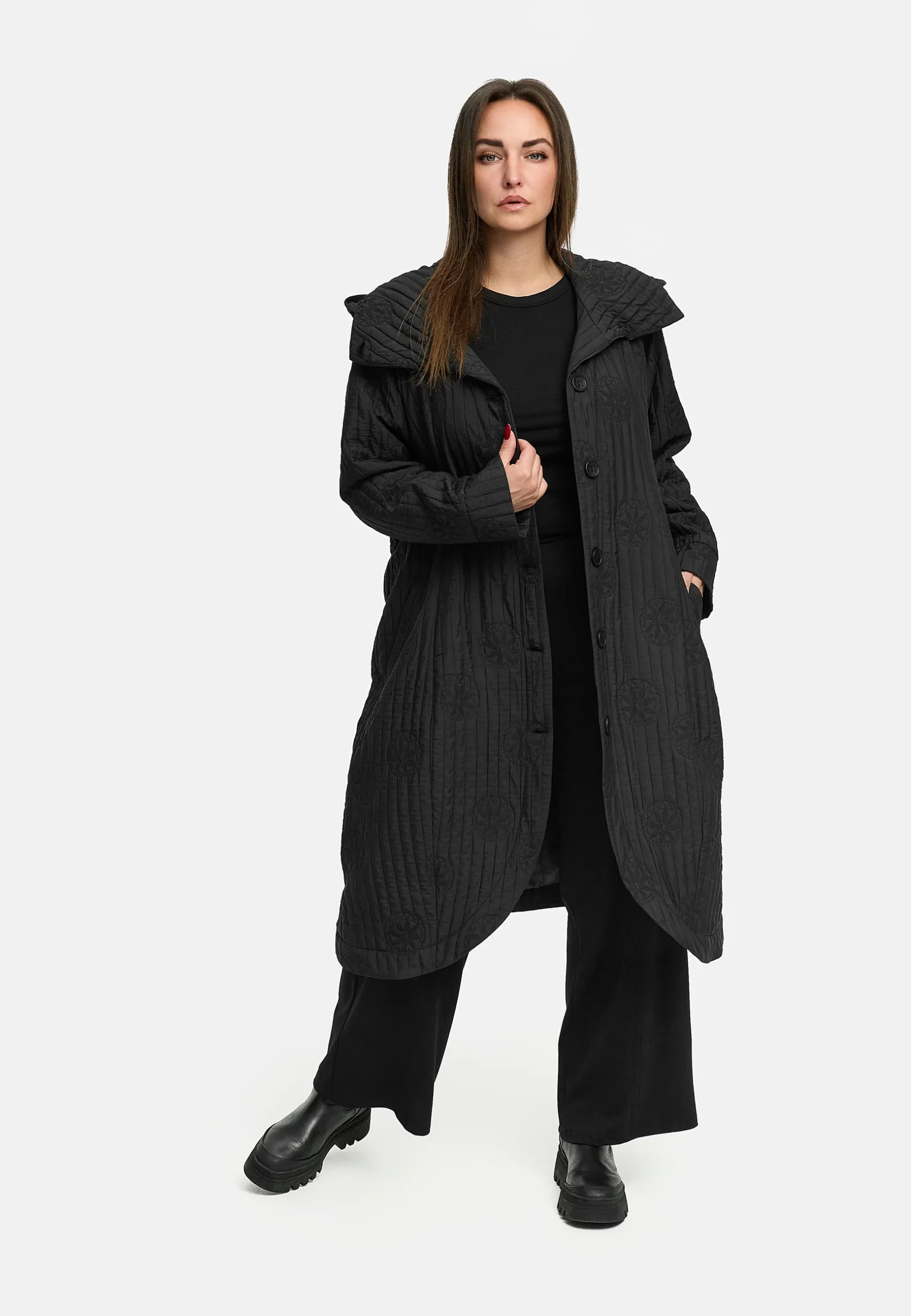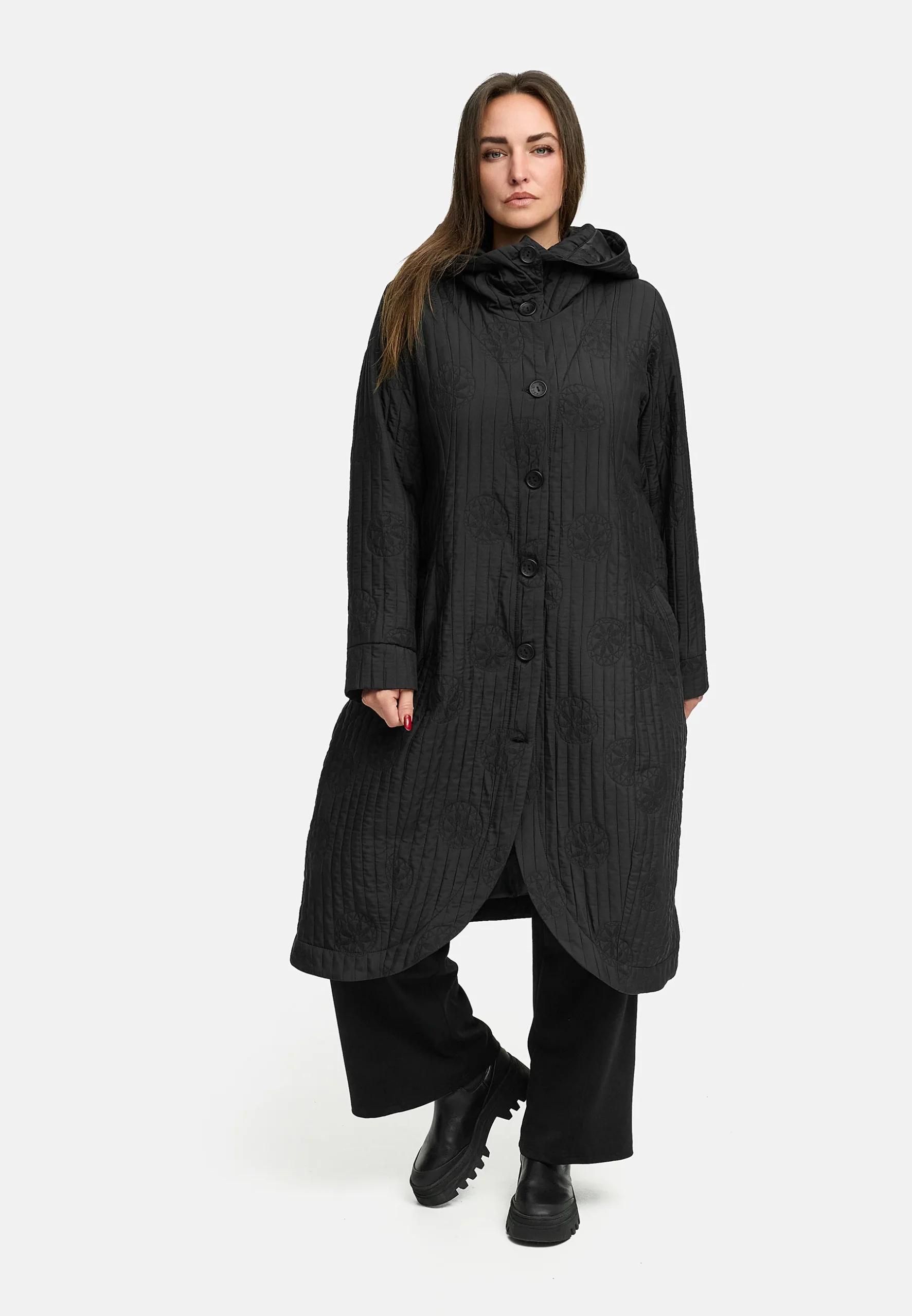• Coupe/Longueur : Silhouette légère en ballon, longueur genou à mi-mollet• Col/Capuche : Capuche généreuse avec col doux et montant• Fermeture : Patte de boutonnage continue à l’avant• Poches : Poches latérales• Design : Surpiqûres verticales avec motifs de quilting circulaires discrets et ton sur ton ; ourlet arrondi à l’avant
