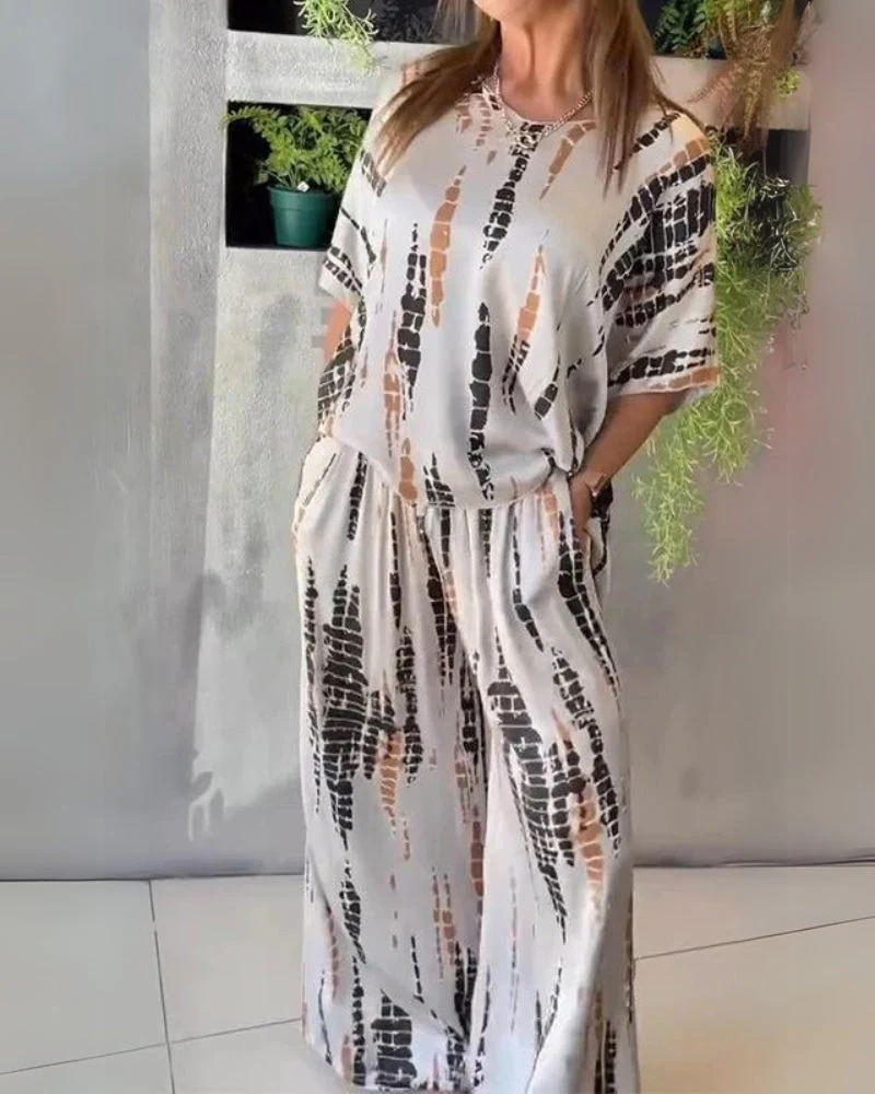 - Ce duo assorti, composé d’un haut et d’un pantalon ample, se distingue par ses teintes éclatantes et ses motifs abstraits.