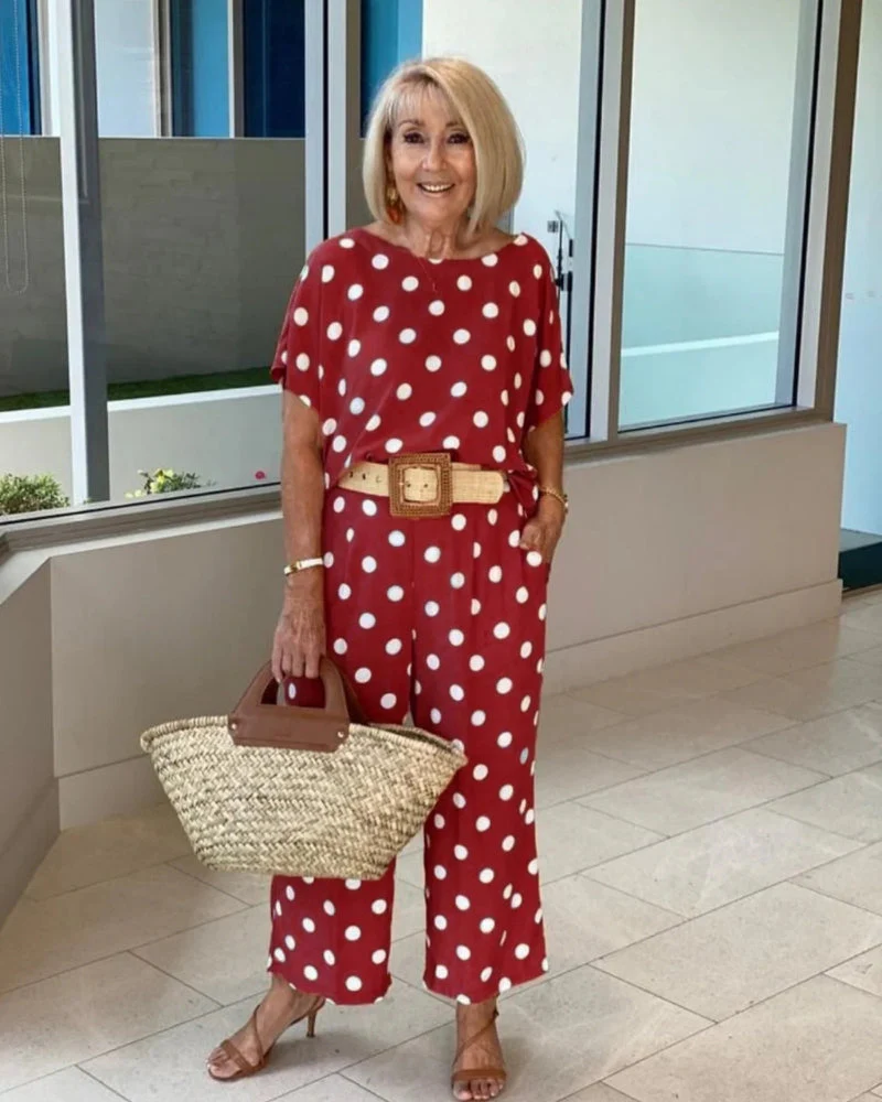 Composé d’un haut ample à pois et d’un pantalon assorti à la cheville, il est idéal pour celles qui recherchent l’équilibre parfait entre confort et style affirmé.