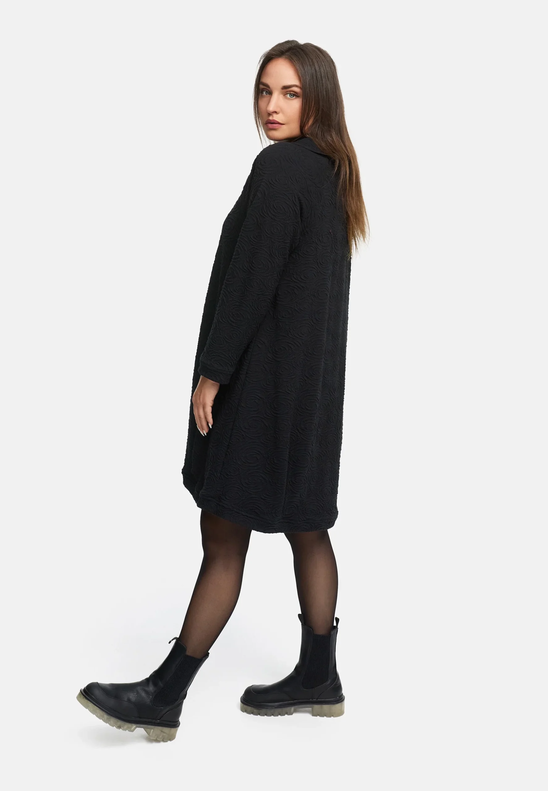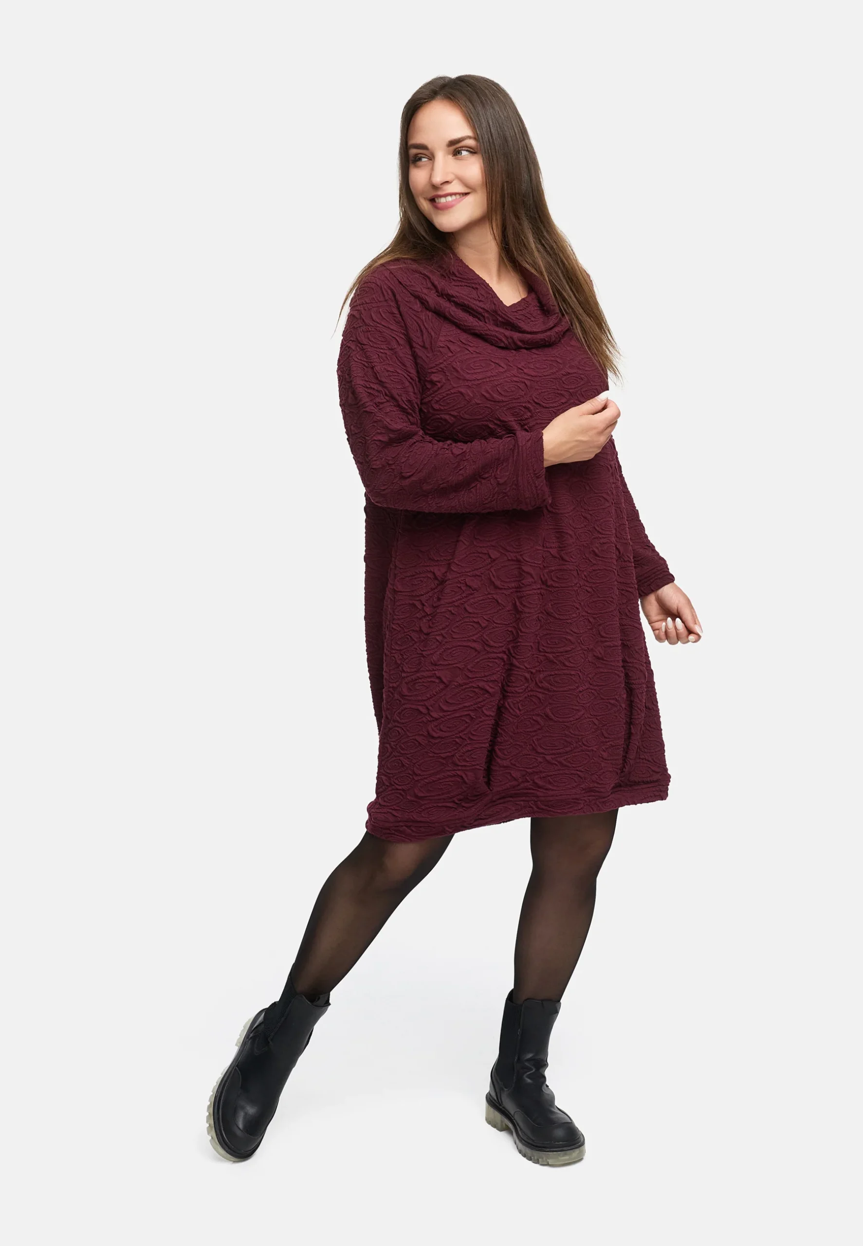 • Coupe : Ample, longueur genou, avec une largeur confortable pour la liberté de mouvement.• Détails : Tissu structuré avec un motif fin, large col bénitier, manches longues.• Couleurs : Disponible en noir et bordeaux.• Style : Élégant et simple – du quotidien au dîner.
