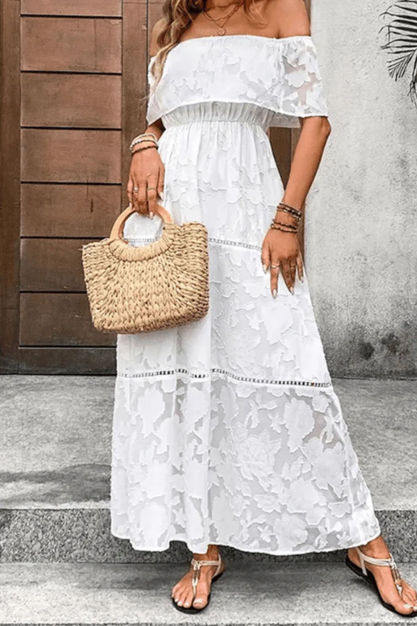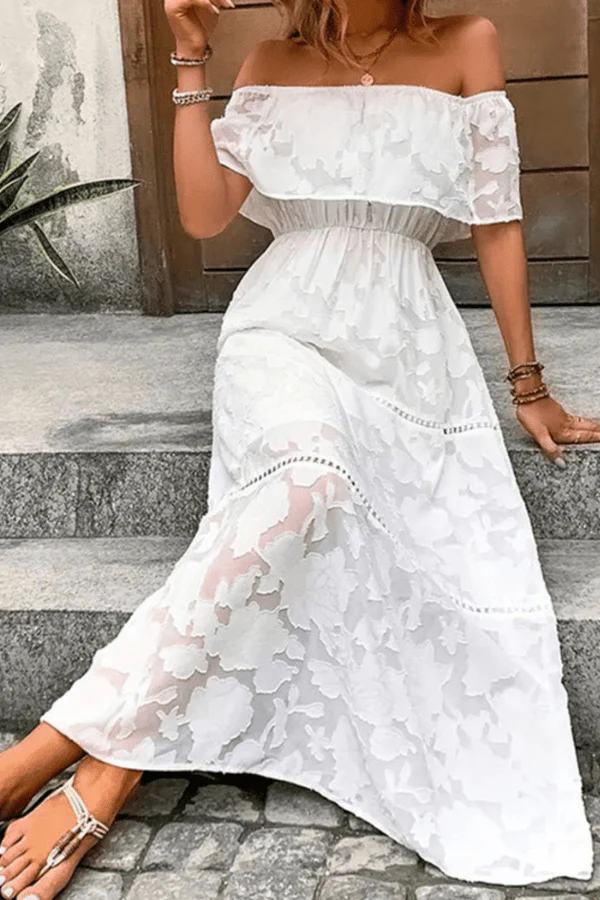 Coupe : Longue, fluide et évasée Matière : Tissu léger et texturé Détails : Épaules dénudées, volant délicat, taille froncée Fermeture : À enfiler, taille élastique Couleur : Blanc pur