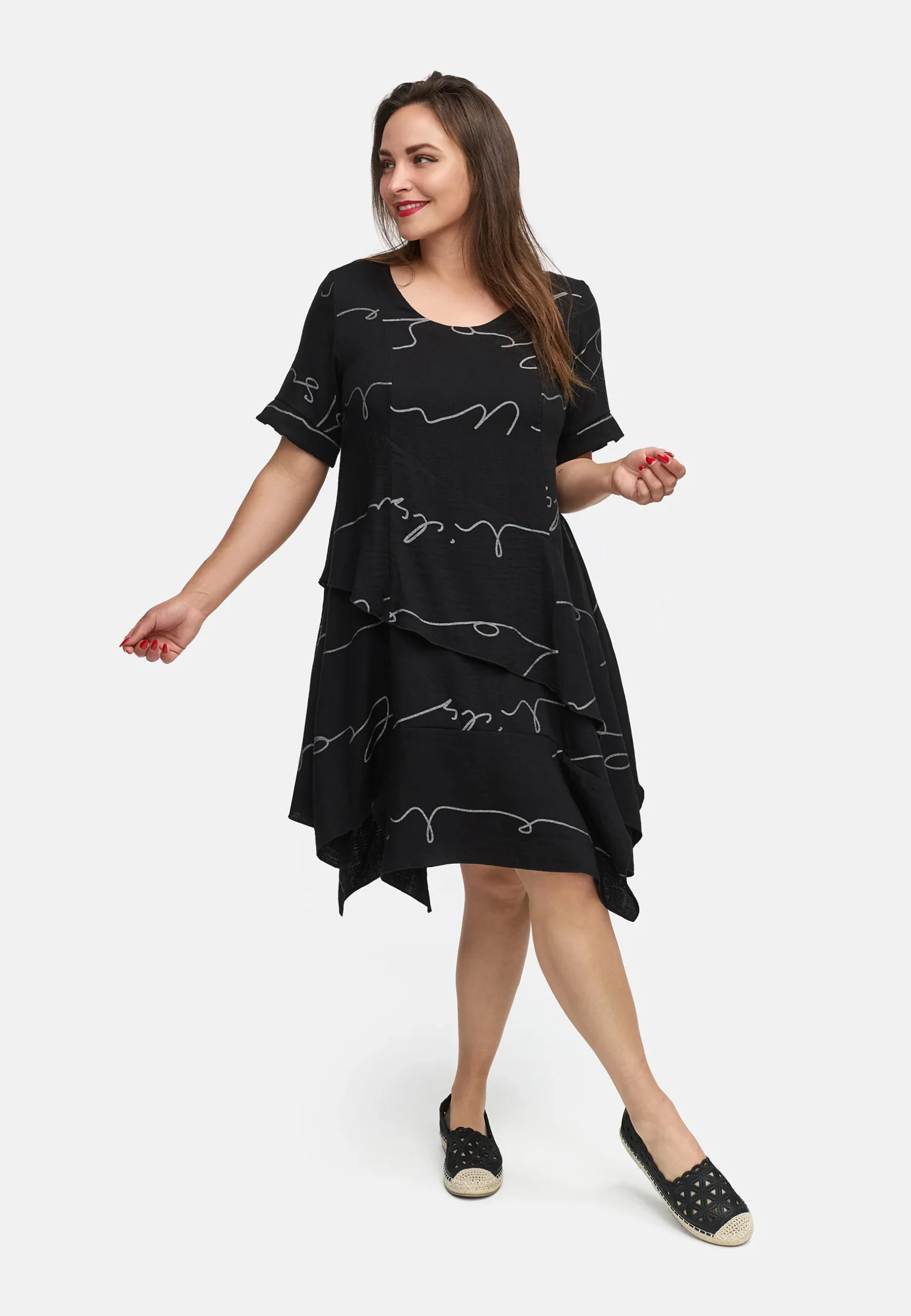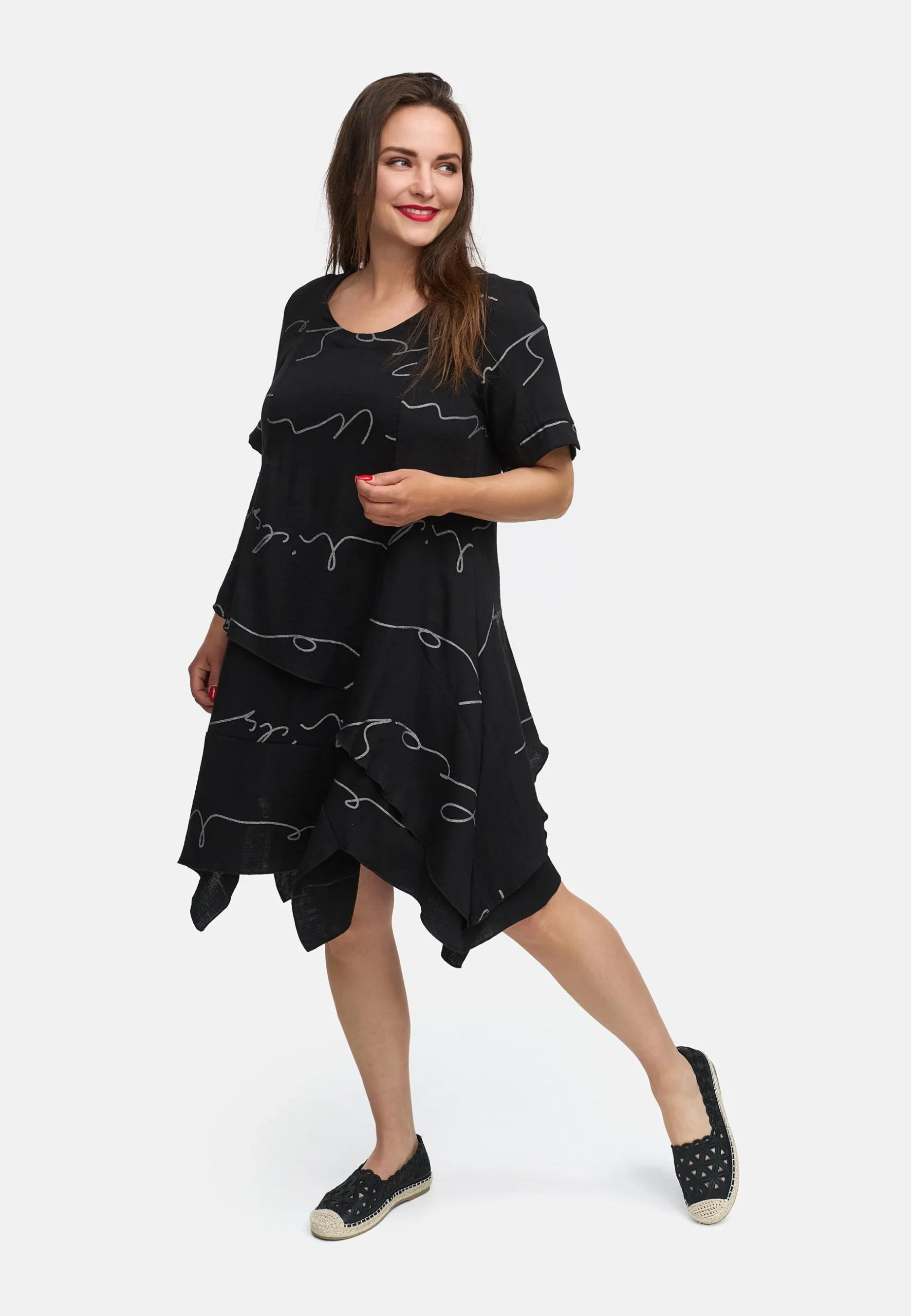 • Silhouette fluide : La coupe ample en ligne A et l’ ourlet asymétrique marqué créent une silhouette unique et flatteuse, qui ondule magnifiquement à chaque mouvement.