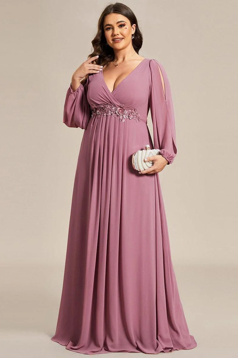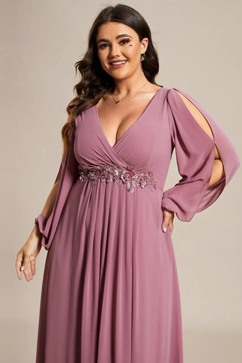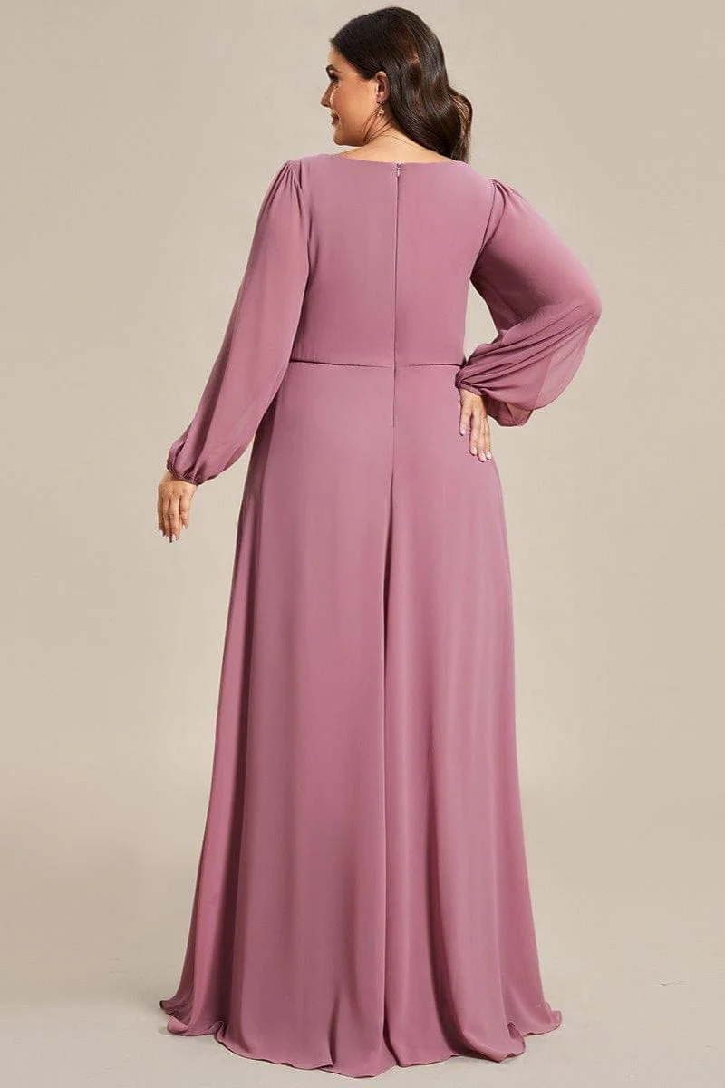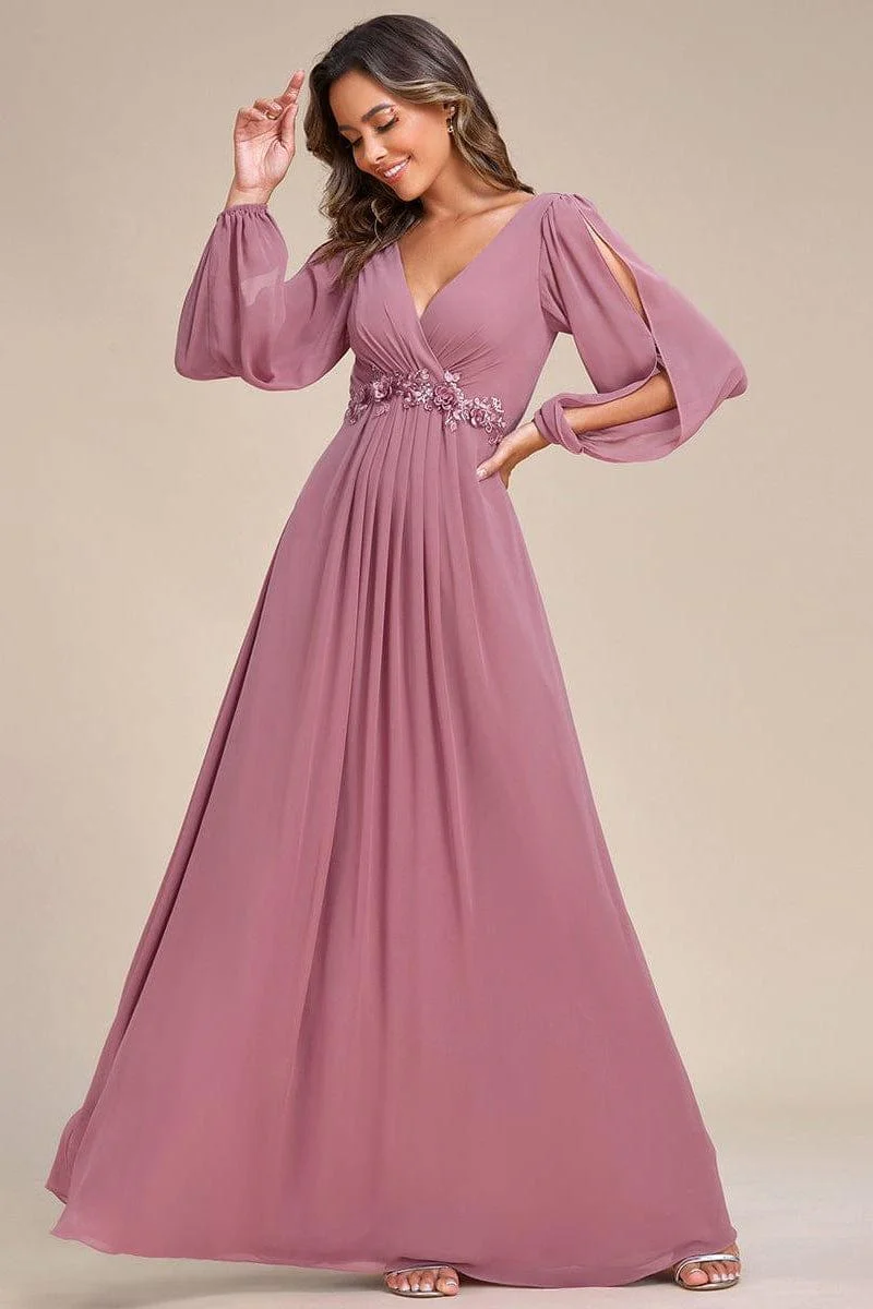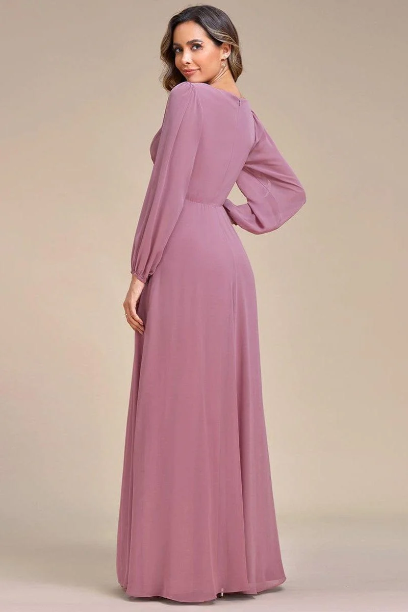 Type de coupe : A-line évasée Matériau : Mousseline de soie (polyester) Fermeture : Zip au dos Manches : Longues, fendues et bouffantes Ornements : Broderies florales à la taille Couleur : Vieux rose