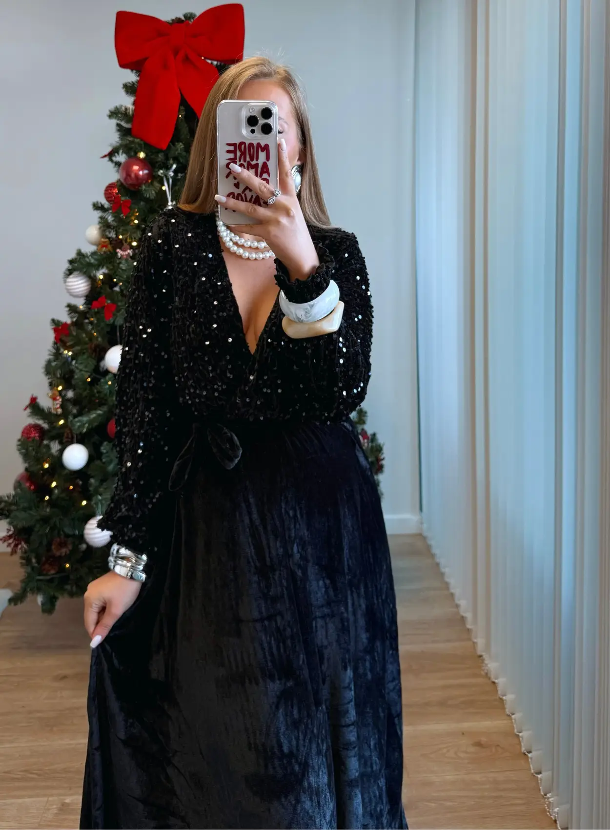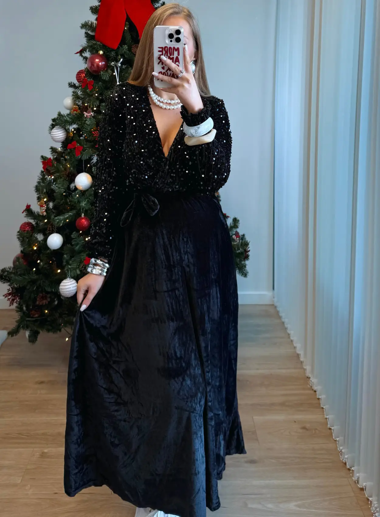 TONNERRE – Robe longue de grossesse à sequins et paillettes noire