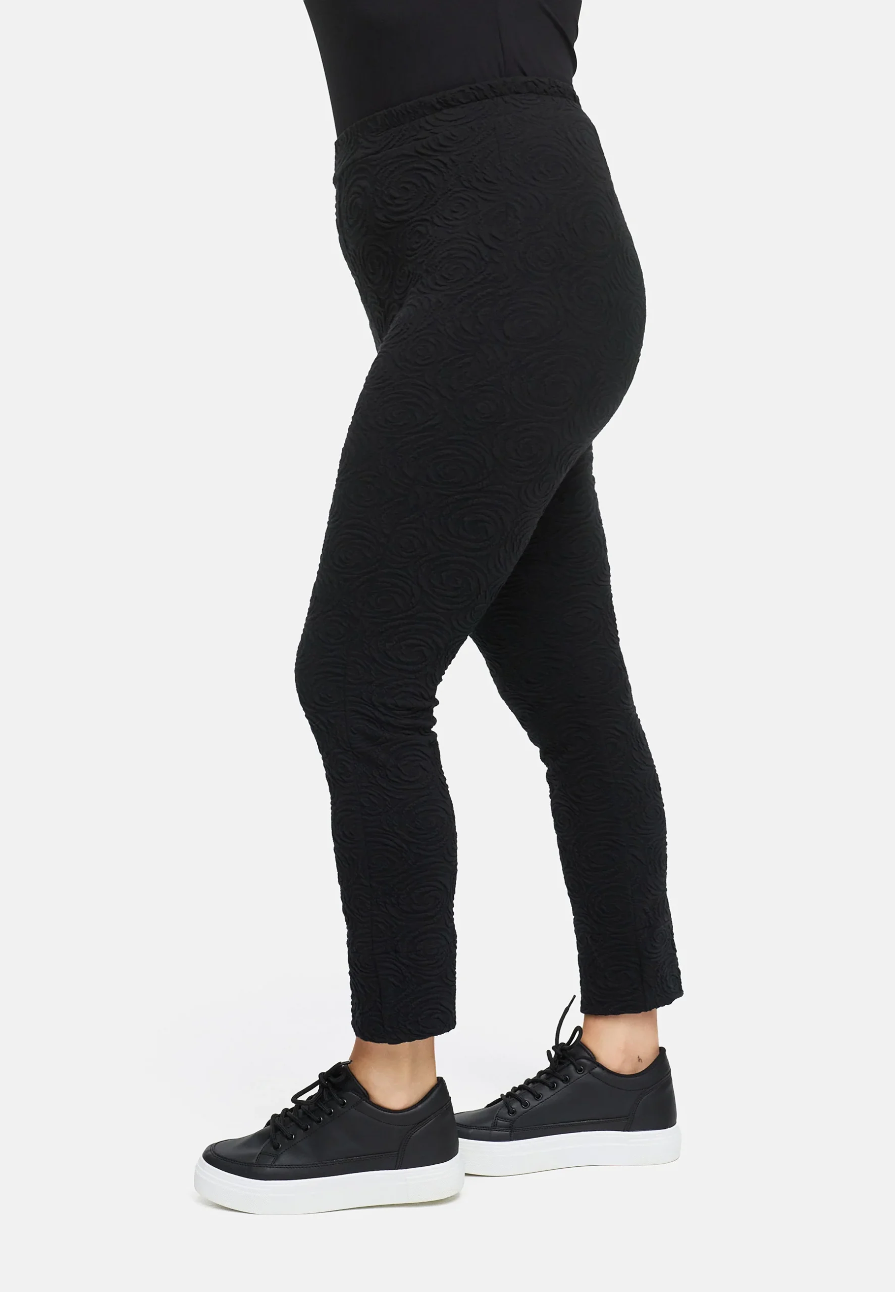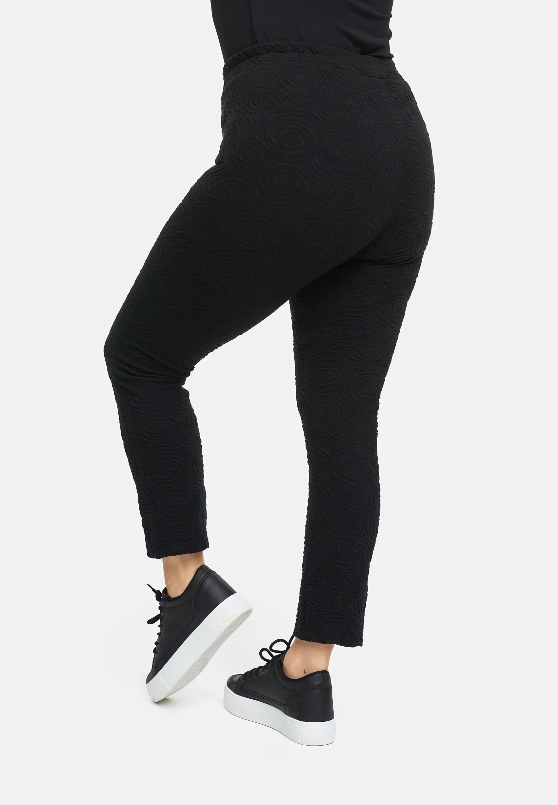 • Coupe : Coupé étroit, ajusté, avec ceinture élastique pour un ajustement confortable.• Détails : Tissu structuré avec motif fin, ceinture élastique confortable.• Couleurs : Disponible en noir et bordeaux.• Style : Élégant comme un pantalon, confortable comme des leggings – idéal pour les affaires et les loisirs.