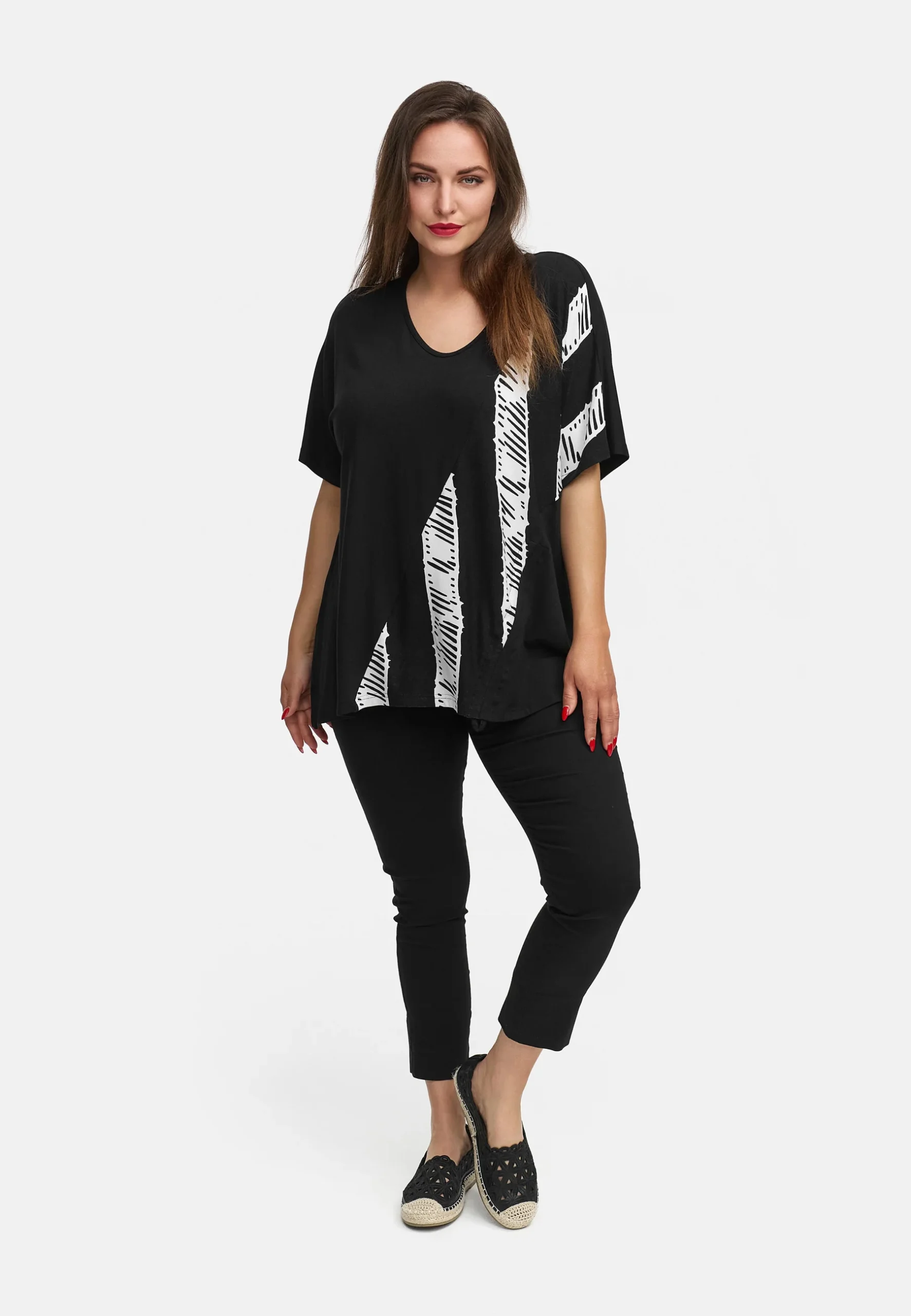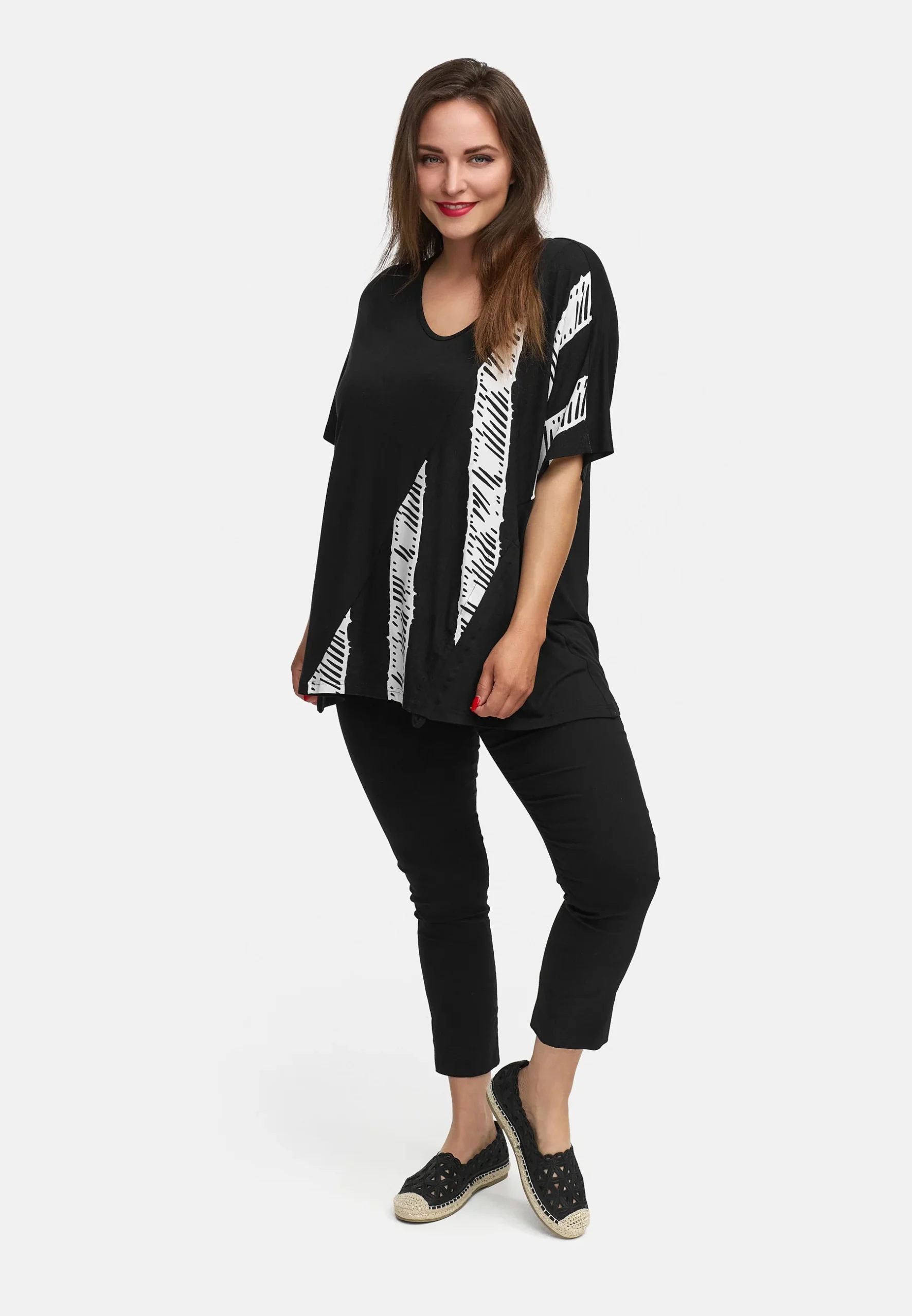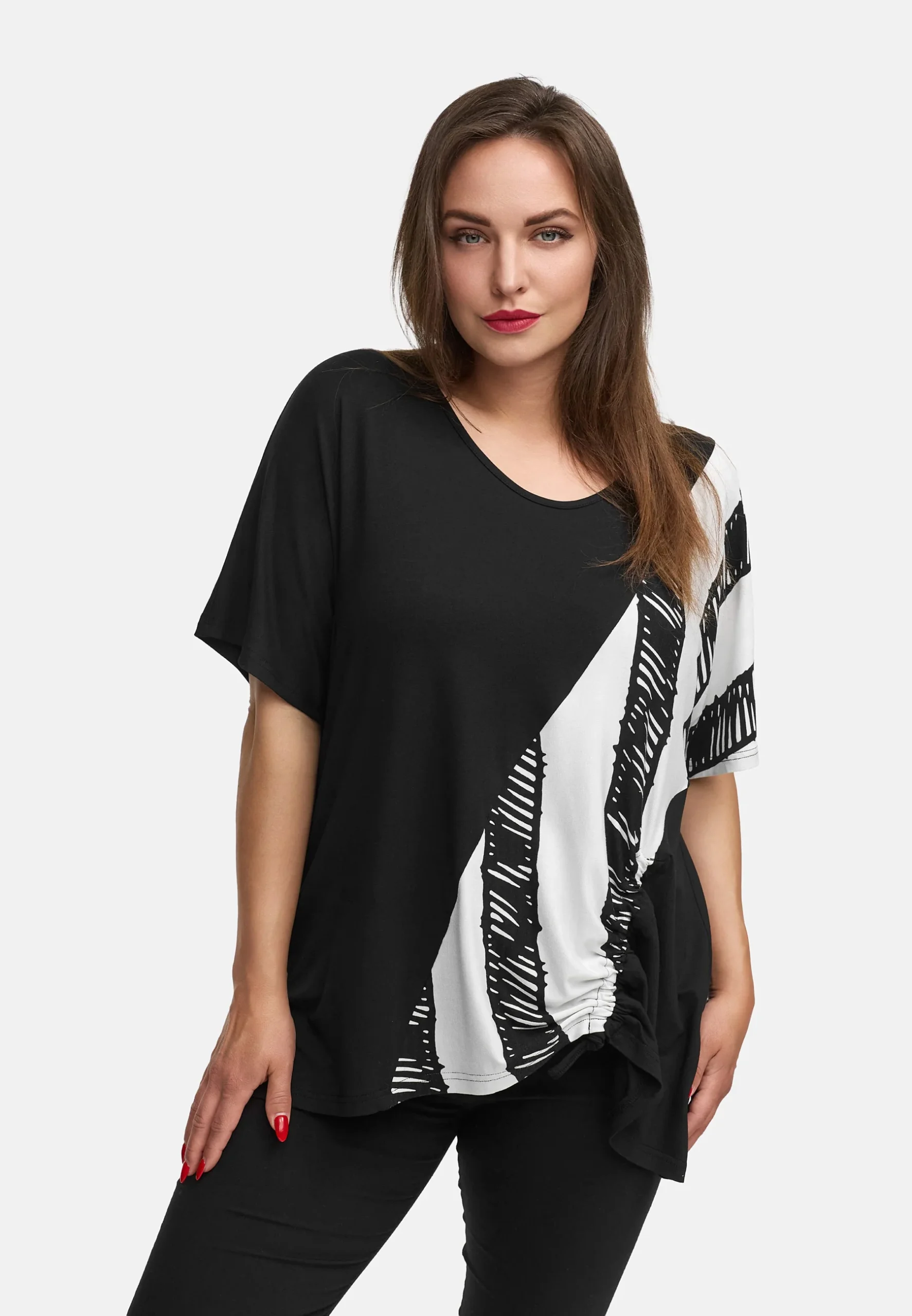 • Design moderne : Cette tunique est une véritable déclaration et séduit par son motif abstrait à partir de bandes irrégulières qui traversent en diagonale le devant.