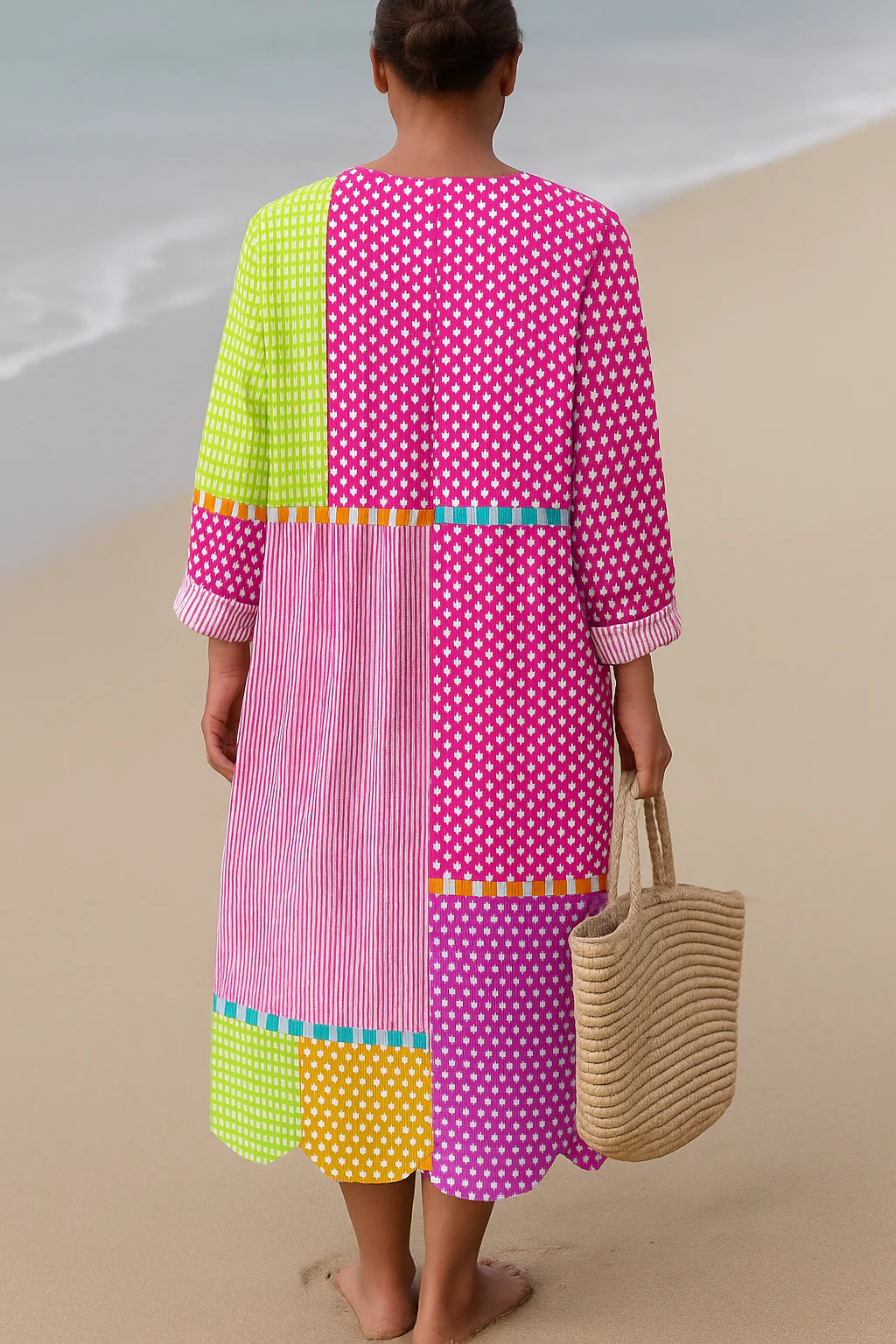 La robe ZÉLIE est une célébration de la couleur et de l’individualité. Avec ses blocs en rose, vert citron, orange, violet et rouge, parsemés de pois et de fines rayures, elle offre un patchwork ludique au style affirmé. Sa coupe ample et son tissu fluide en font un vêtement aussi confortable qu’inoubliable.