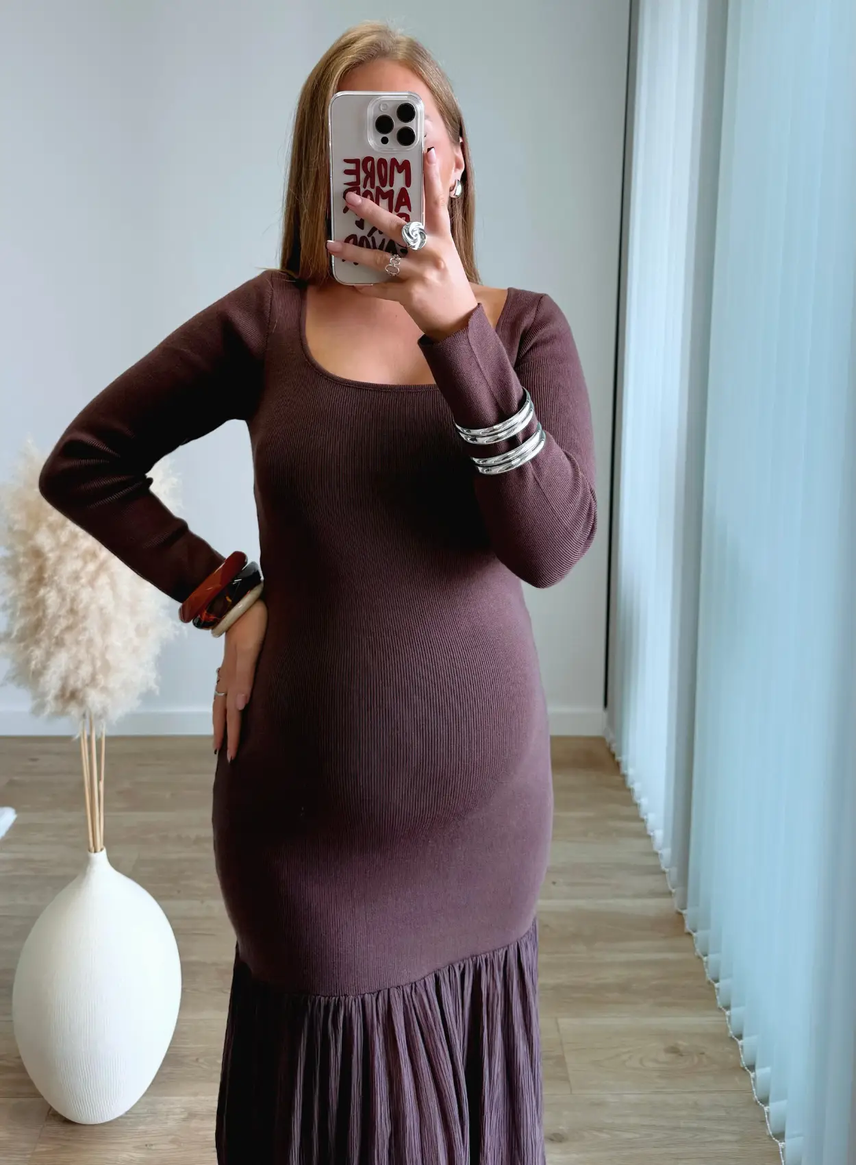 ALESSIA – Robe longue de grossesse côtelée et plissée chocolat