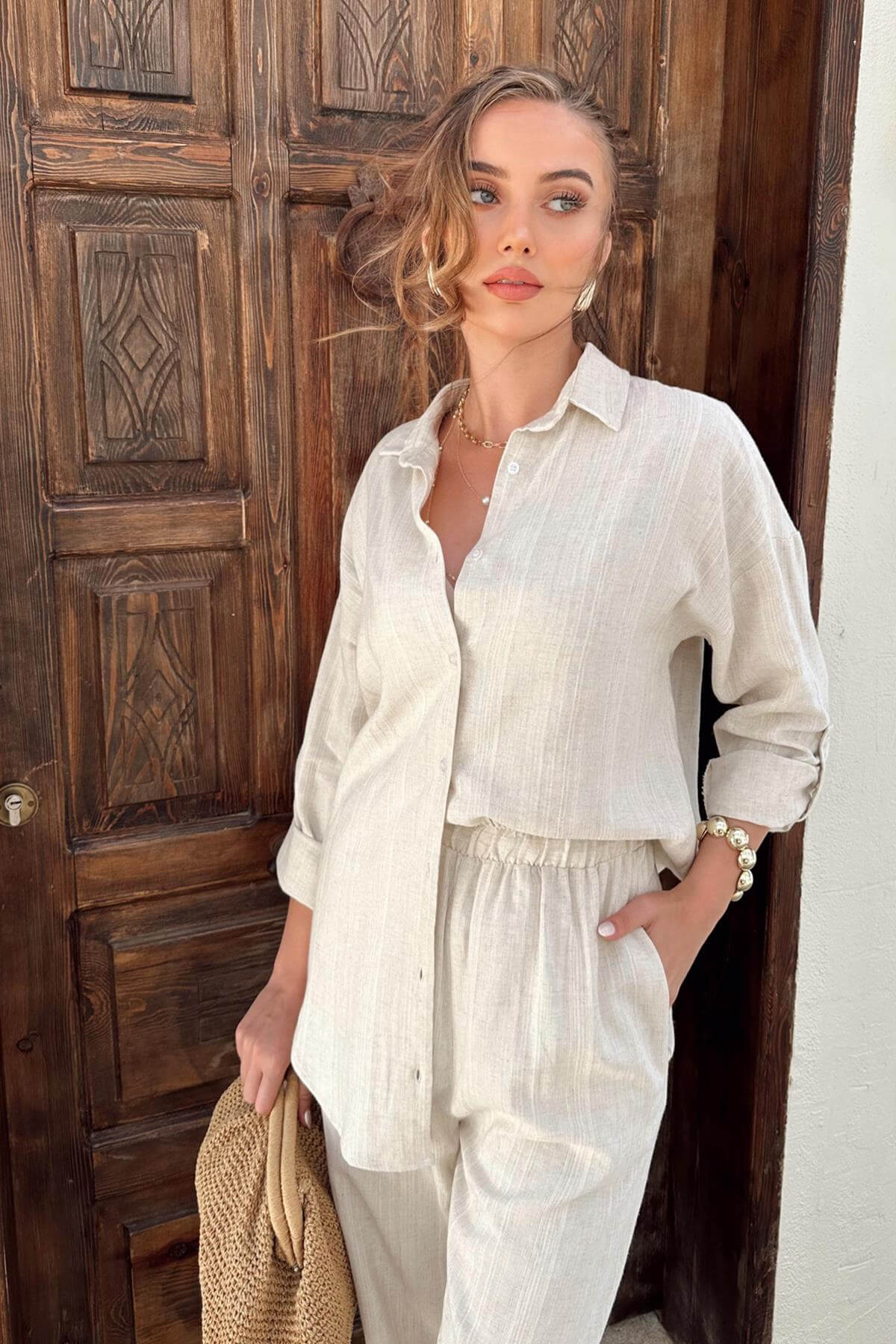 Ensemble Chemise et Pantalon en Nid d’Abeille Jacquar – Élégance et Confort