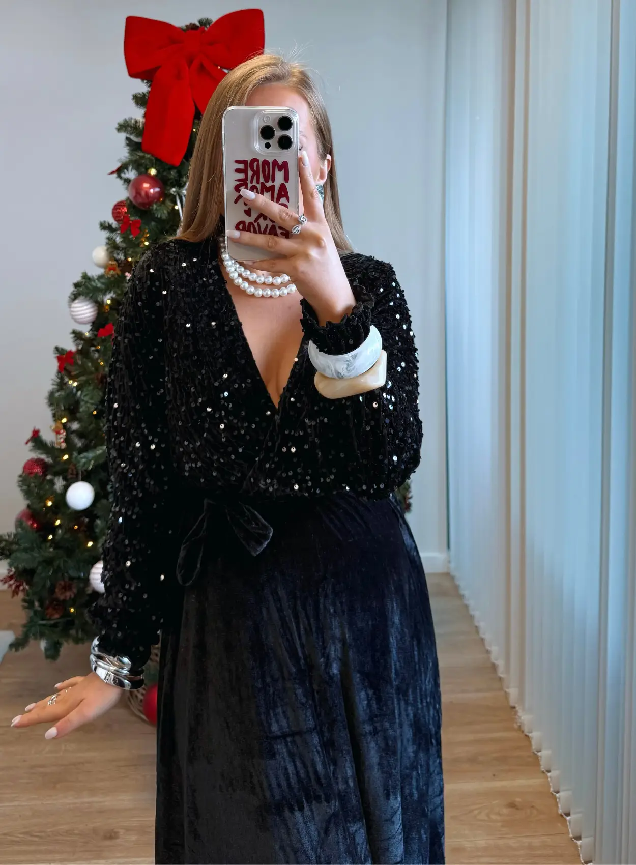 TONNERRE – Robe longue de grossesse à sequins et paillettes noire