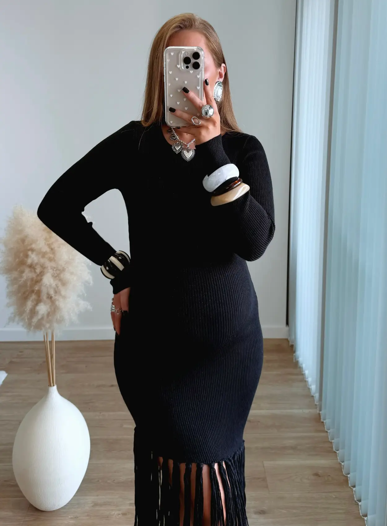 WENDY – Robe longue de grossesse côtelée noire à franges